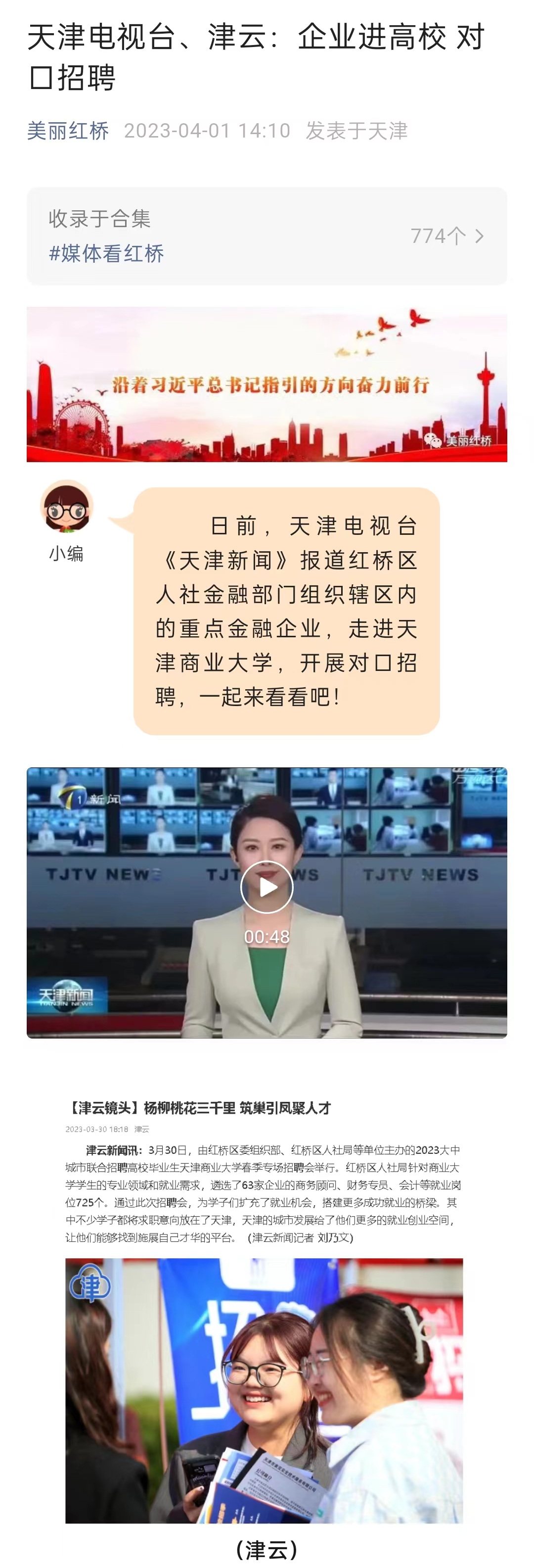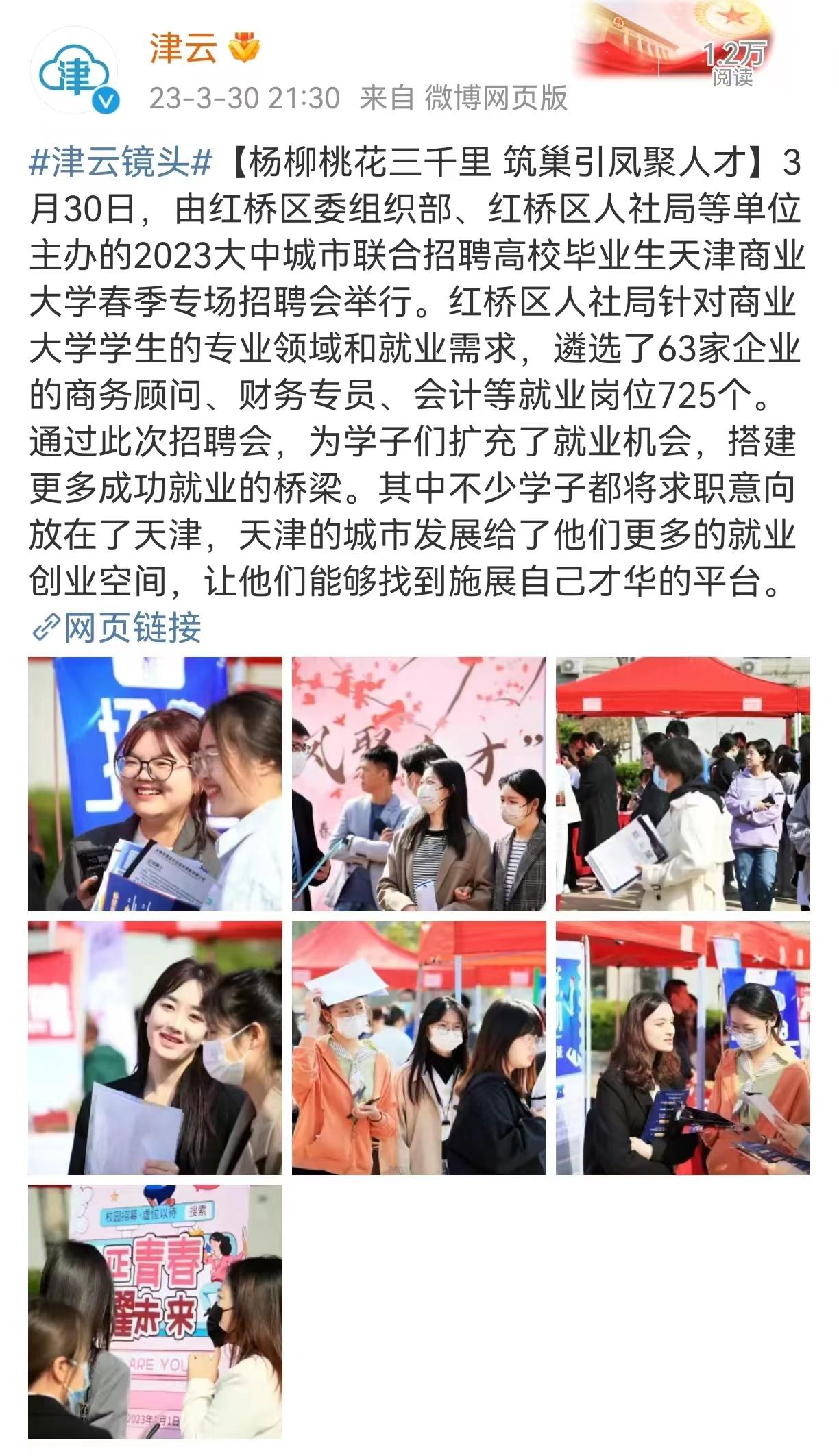 日前,天津新聞、津云、美麗紅橋報(bào)道學(xué)校舉辦“楊柳桃花三千里 筑巢引鳳聚人才”專場招聘會。3月30日,紅橋區(qū)委組織部、人社局、金融局聯(lián)合天津商業(yè)大學(xué)經(jīng)濟(jì)學(xué)院、天津商業(yè)大學(xué)招生與就業(yè)處在學(xué)校綜合辦公樓西側(cè)籃球場舉辦“楊柳桃花三千里 筑巢引鳳聚人才”春季專場招聘會。