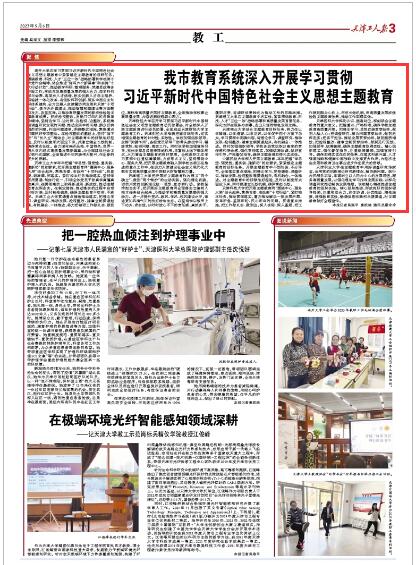 5月6日,《天津工人報》報道學校深入開展學習貫徹習近平新時代中國特色社會主義思想主題教育。學校結合主題教育目標任務,努力在以學鑄魂、以學增智、以學正風、以學促干四個方面下功夫,學習貫徹中明確內容,將理論學習、調查研究、推動發展、檢視整改、建章立制貫通起來,有機融合、一體推進。同時加強組織領導,學校各級黨組織以高度的責任感和使命感,強化責任落實,加強統籌協調,做好宣傳引導,嚴格督促指導,確保主題教育取得扎實成效。