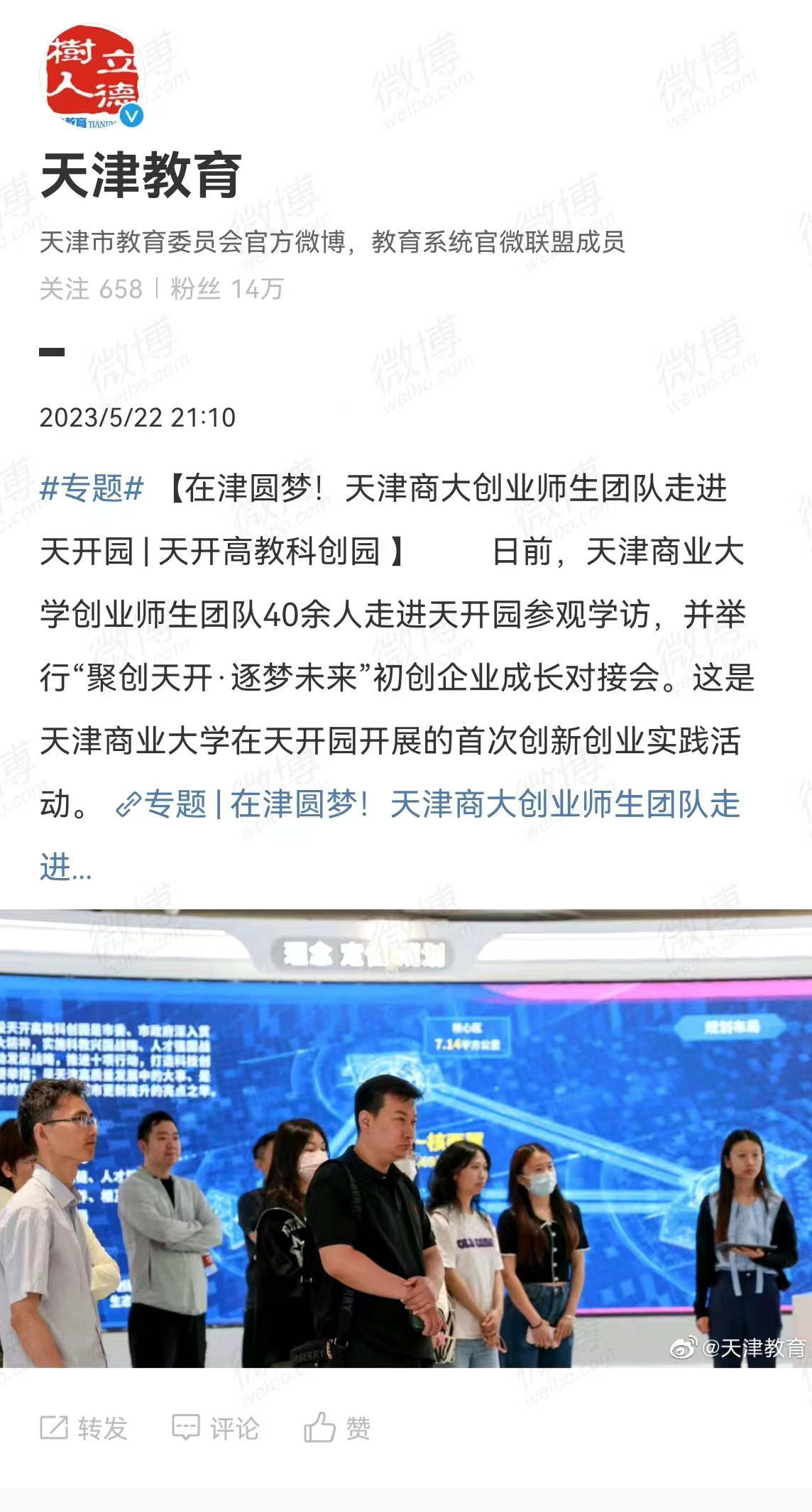 5月22日,中國日報中文網(wǎng)、《天津教育報》微信公眾號、市教委官方微博報道學(xué)校在天開園開展首次創(chuàng)新創(chuàng)業(yè)實踐活動。5月20日上午,天津商業(yè)大學(xué)創(chuàng)業(yè)師生團隊40余人走進天開園參觀學(xué)訪并在天開高教科創(chuàng)園靈犀匯舉行“聚創(chuàng)天開·逐夢未來”初創(chuàng)企業(yè)成長對接會。