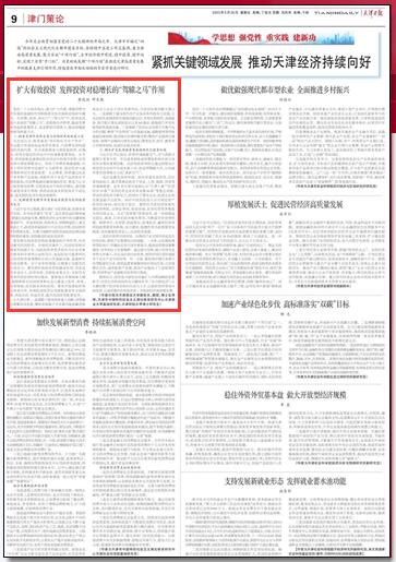 5月26日,《天津日報》“津門策論”主題教育專版刊發副校長黃鳳羽教授的理論文章《擴大有效投資 發揮投資對穩增長的“駕轅之馬”作用》。