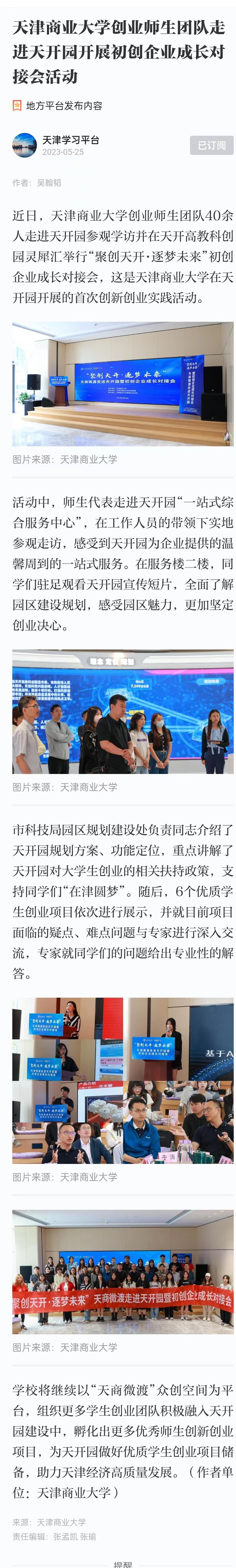 5月25日,學習強國天津平臺報道學校創業師生團隊走進天開園開展初創企業成長對接會活動。近日,天津商業大學創業師生團隊40余人走進天開園參觀學訪并在天開高教科創園靈犀匯舉行“聚創天開·逐夢未來”初創企業成長對接會,這是天津商業大學在天開園開展的首次創新創業實踐活動。