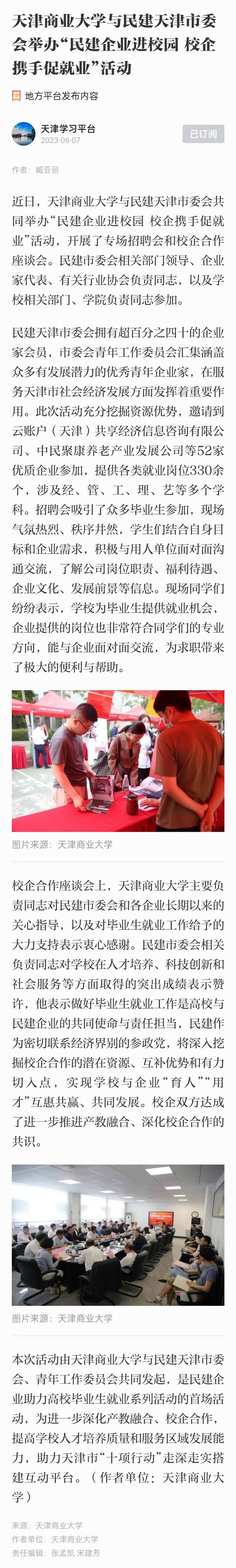 6月7日,學習強國天津平臺報道學校與民建天津市委會舉辦“民建企業進校園 校企攜手促就業”活動。近日,天津商業大學與民建天津市委會共同舉辦“民建企業進校園 校企攜手促就業”活動,開展了專場招聘會和校企合作座談會。民建市委會相關部門領導、企業家代表、有關行業協會負責同志,以及學校相關部門、學院負責同志參加。