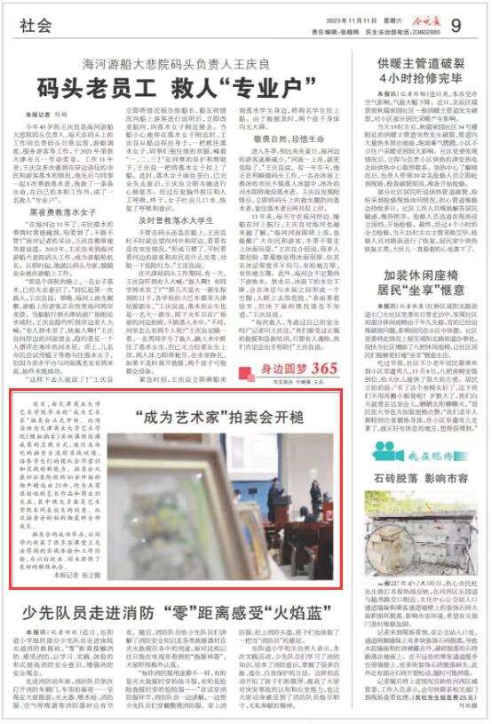 11月11日,《今晚報(bào)》報(bào)道我校藝術(shù)學(xué)院“成為藝術(shù)家”拍賣(mài)會(huì)。近日,由天津商業(yè)大學(xué)藝術(shù)學(xué)院舉辦的“成為藝術(shù)家”拍賣(mài)會(huì)正式開(kāi)槌。此項(xiàng)活動(dòng)為天津商業(yè)大學(xué)藝術(shù)學(xué)院《模擬拍賣(mài)》實(shí)訓(xùn)課程結(jié)課成果的呈現(xiàn)方式,通過(guò)具體化的拍賣(mài)全流程實(shí)戰(zhàn)訓(xùn)練,培養(yǎng)學(xué)生們的團(tuán)隊(duì)合作意識(shí)和實(shí)踐創(chuàng)新能力。