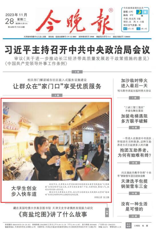 11月28日,《今晚報》頭版報道學校天商微渡眾創(chuàng)空間“遇咖啡”休閑空間。