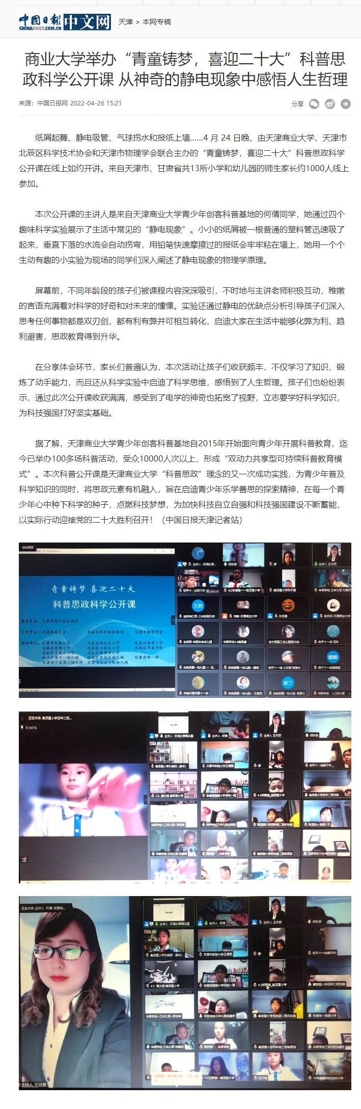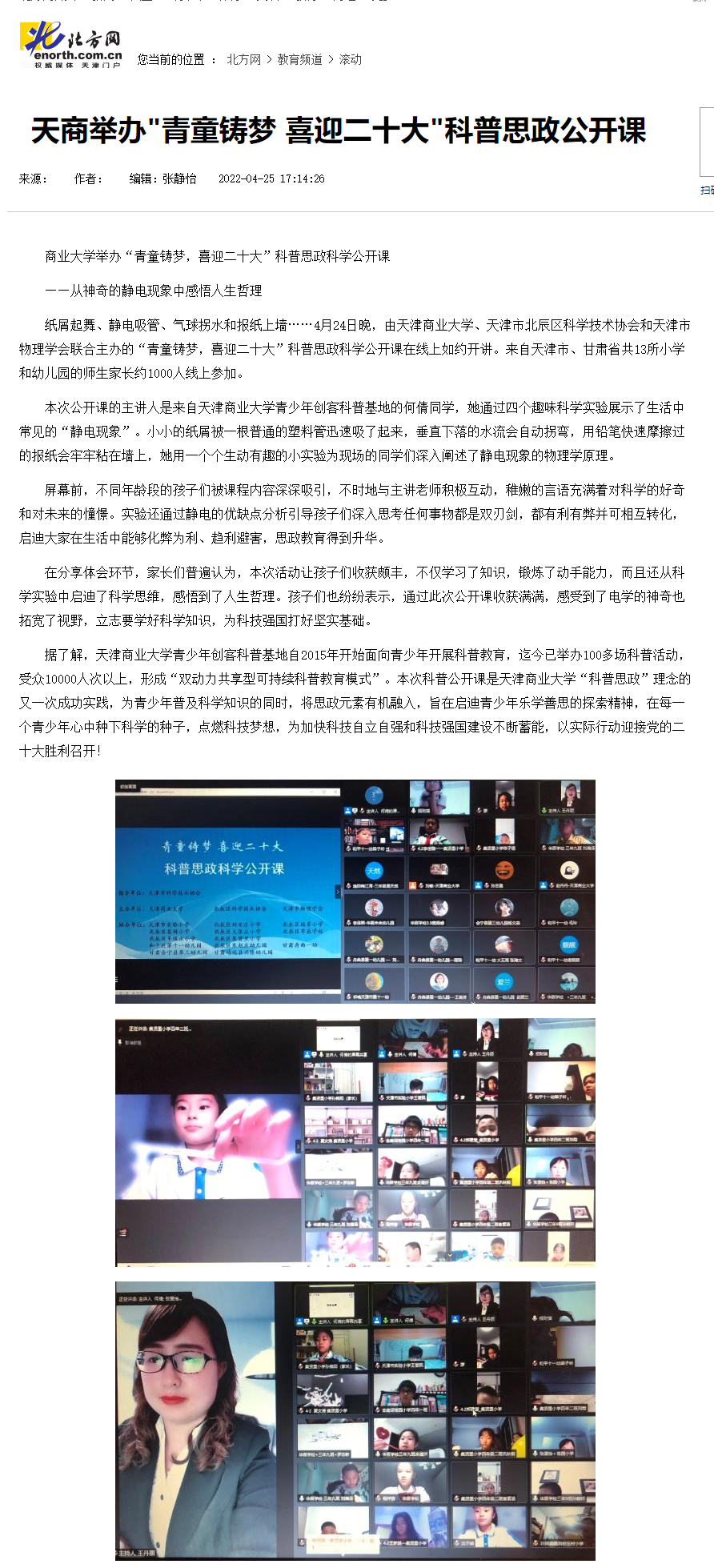 4月24日晚,在天津市科學技術協會的指導下,我校與北辰區科學技術協會、天津物理學會聯合舉辦“青童鑄夢,喜迎二十大”科普思政科學公開課。4月25日,北方網、津云客戶端以“天商舉辦‘青童鑄夢 喜迎二十大’科普思政公開課”為題進行了報道。4月26日,中國日報網以“商業大學舉辦‘青童鑄夢,喜迎二十大’科普思政科學公開課 從神奇的靜電現象中感悟人生哲理”為題進行了報道。