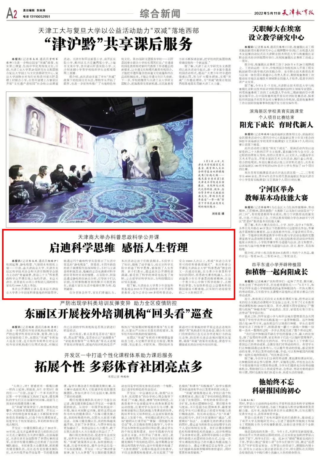 5月11日,《天津教育報》報道我校、天津市北辰區科學技術協會和天津市物理學會聯合主辦的“青童鑄夢,喜迎二十大”科普思政科學公開課在線上如約開講。