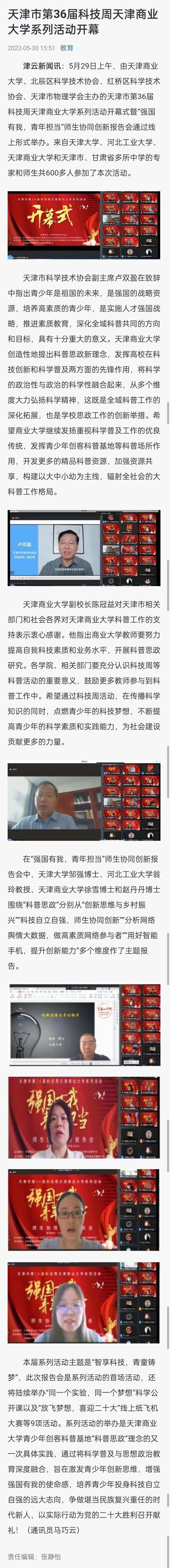 5月30日,津云客戶端報(bào)道天津市第36屆科技周天津商業(yè)大學(xué)系列活動(dòng)開(kāi)幕。5月29日上午,由天津商業(yè)大學(xué)、北辰區(qū)科學(xué)技術(shù)協(xié)會(huì)、紅橋區(qū)科學(xué)技術(shù)協(xié)會(huì)、天津市物理學(xué)會(huì)主辦的天津市第36屆科技周天津商業(yè)大學(xué)系列活動(dòng)開(kāi)幕式暨“強(qiáng)國(guó)有我,青年擔(dān)當(dāng)”師生協(xié)同創(chuàng)新報(bào)告會(huì)通過(guò)線上形式舉辦。
