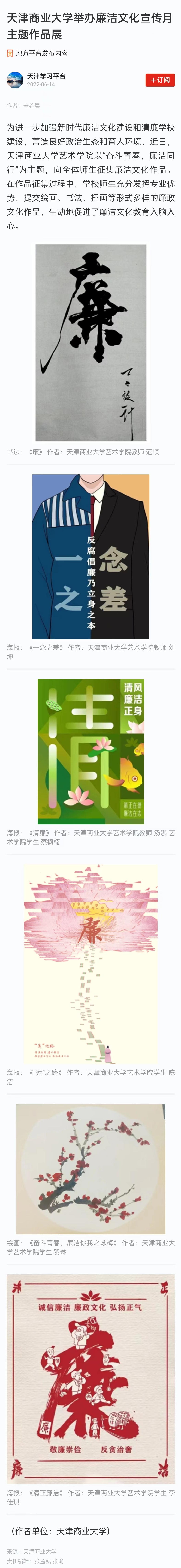 6月14日,學習強國天津平臺報道我校藝術學院舉辦廉潔文化宣傳月主題作品展。近日,天津商業(yè)大學藝術學院以“奮斗青春,廉潔同行”為主題,向全體師生征集廉潔文化作品。在作品征集過程中,學校師生充分發(fā)揮專業(yè)優(yōu)勢,提交繪畫、書法、插畫等形式多樣的廉政文化作品,生動地促進了廉潔文化教育入腦入心。