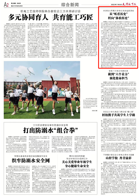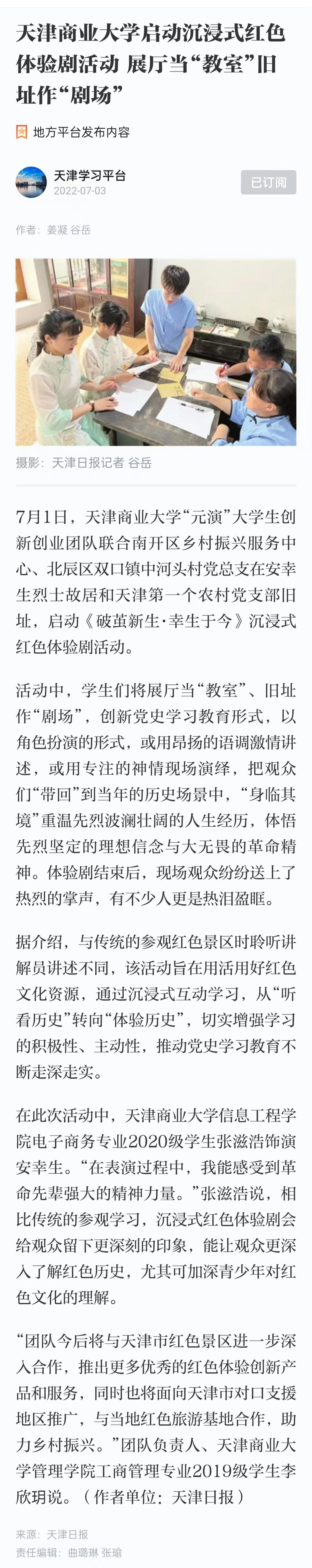 日前,央廣網、學習強國、津云客戶端、《天津日報》、《天津教育報》、天津新聞報道我校開展沉浸式紅色體驗劇主題活動。7月1日,天津商業大學“元演”大學生創新創業團隊聯合南開區鄉村振興服務中心和北辰區雙口鎮中河頭村黨總支在安幸生烈士故居和天津農村第一黨支部舊址,啟動《破繭新生? 幸生于今》沉浸式紅色體驗劇主題活動。來自天津商業大學、南開區鄉村振興服務中心和中河頭村的30余名黨員和群眾參與體驗活動。