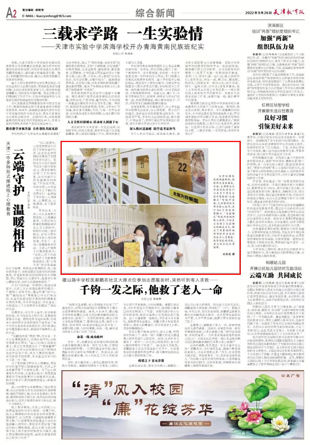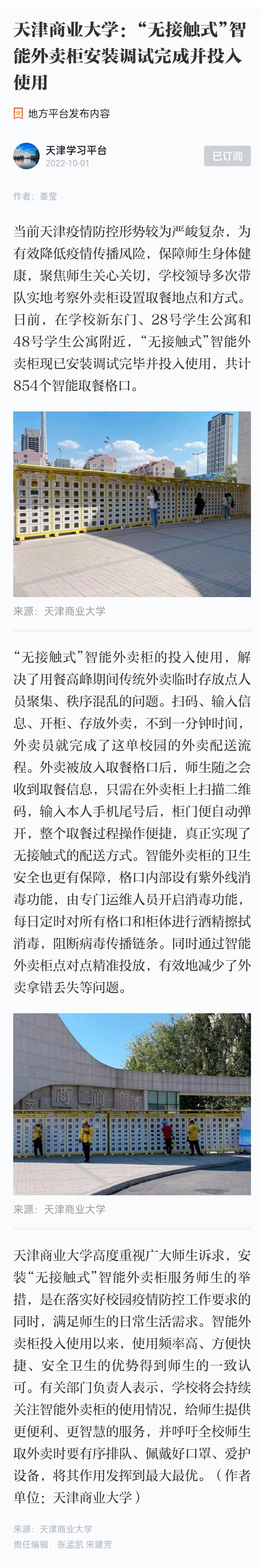 9月26日,《天津教育報》A2版報道我校“無接觸式”智能外賣柜安裝調(diào)試完成并投入使用。10月1日,學習強國天津平臺也進行了專題報道。