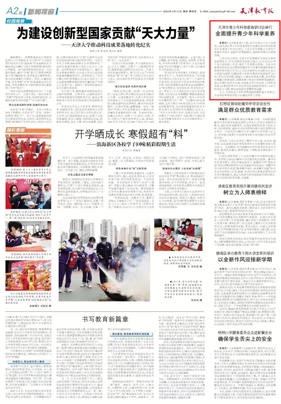 2月13日,《天津教育報》A2版報道學校舉辦第三屆天津市青少年科普教育研討會暨天津市科普思政研究會籌備工作會議。