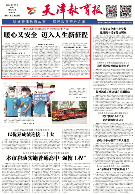 9月7日,《天津教育報》A1版以“本市高校陸續迎來2022級新生入學暖心又安全 邁入人生新征程”報道我校2022級新生入校有關情況。