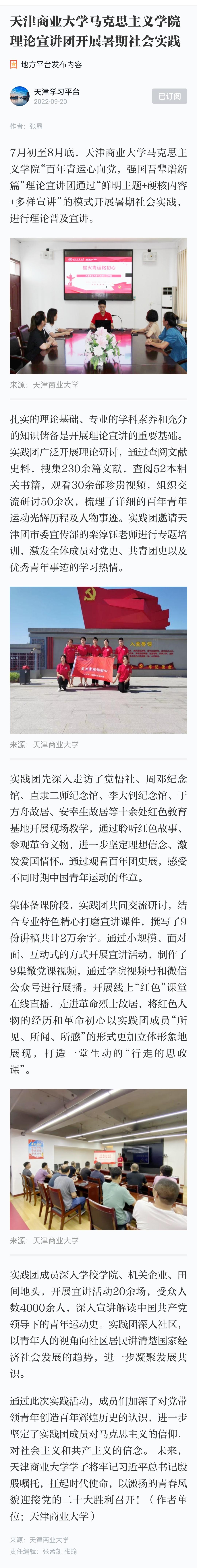 9月2日,津云客戶端以“以青年視角,悟初心使命;以青春之聲,頌時代強音——天津商業大學‘百年青運心向黨,強國吾輩譜新篇’”,今日頭條以“深入一線!天津商大理論宣講團歷時兩月進行理論普及和宣講”,9月20日,學習強國以“天津商業大學馬克思主義學院理論宣講團開展暑期社會實踐”報道馬克思主義學院“百年青運心向黨,強國吾輩譜新篇”理論宣講團。