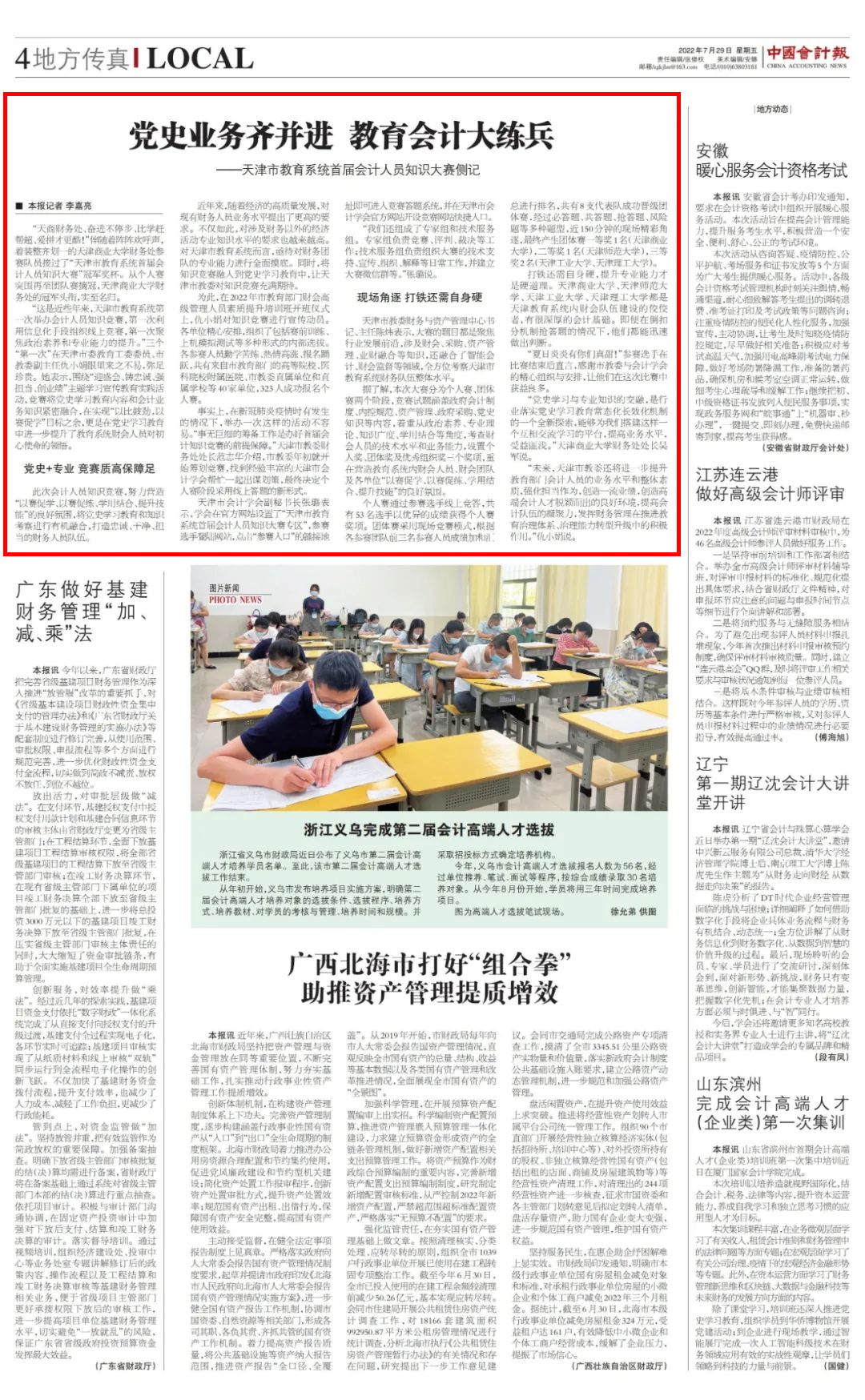 7月29日,《中國會計(jì)報(bào)》第四版刊發(fā)《黨史業(yè)務(wù)齊并進(jìn) 教育會計(jì)大練兵——天津市教育系統(tǒng)首屆會計(jì)人員知識大賽側(cè)記》,報(bào)道我校財(cái)務(wù)處代表隊(duì)參加天津市教育系統(tǒng)首屆會計(jì)人員知識大賽有關(guān)情況。
