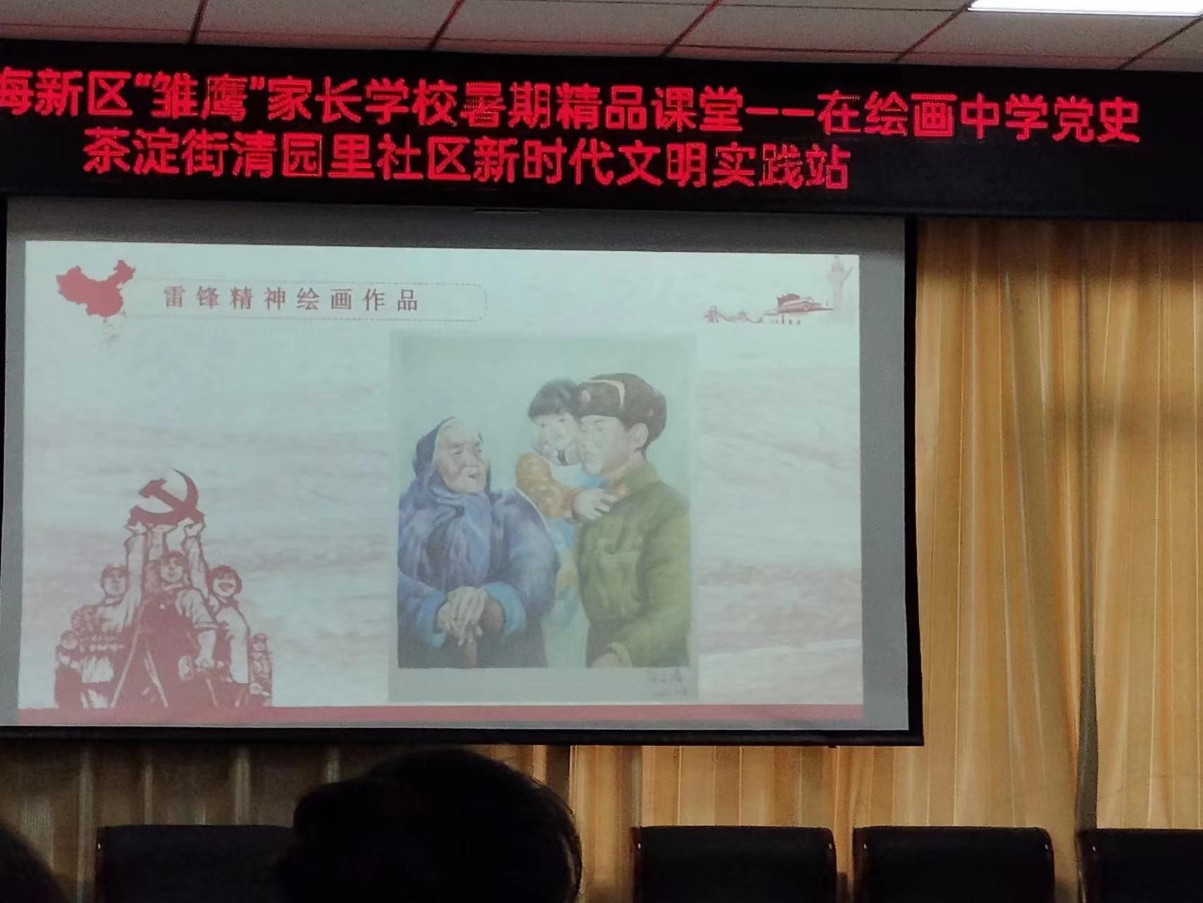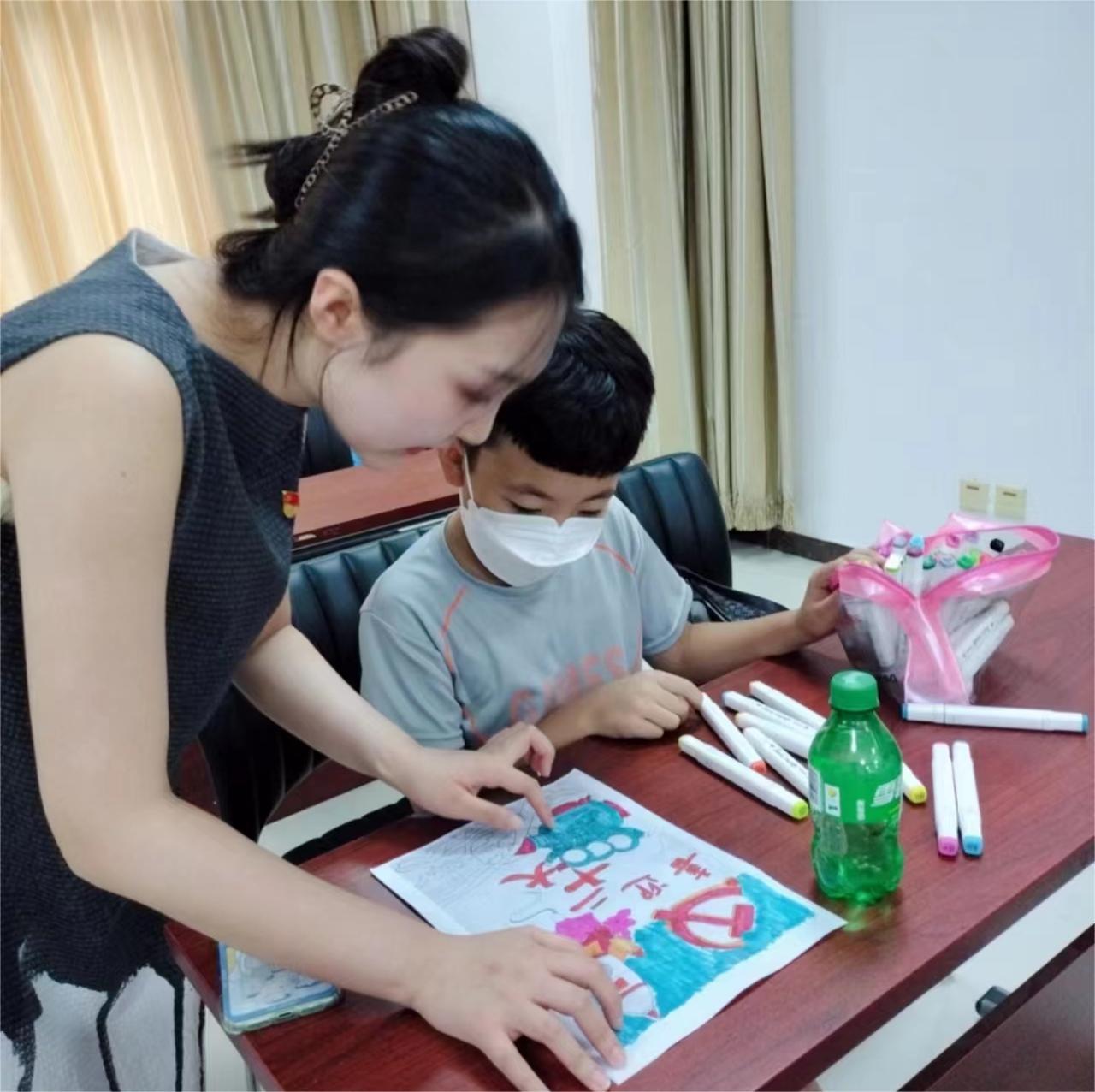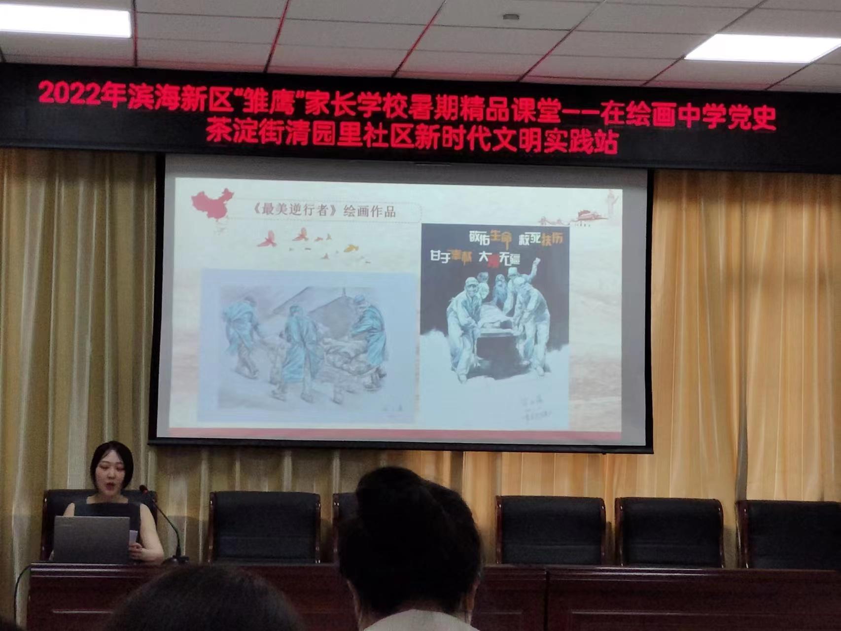 她從“青年興則國家興,青年強則國家強”的角度,激發廣大青少年立牢為國為民之志,要懷著一份赤子的情懷廣泛學習黨史,把愛國之情、報國之志化為實際行動,在新時代貢獻自己的力量。學生和家長在一幅幅精美的繪畫和剪紙作品中,重溫了紅船精神、西柏坡精神,又聽到了雷鋒的故事,更是看到了3年來一線醫務工作者、社區工作者、志愿者們的抗疫防疫的畫面,深刻體會到身邊榜樣的力量。講課結束后,畢天叆現場指導孩子們進行“喜迎黨的二十大”繪畫作品。