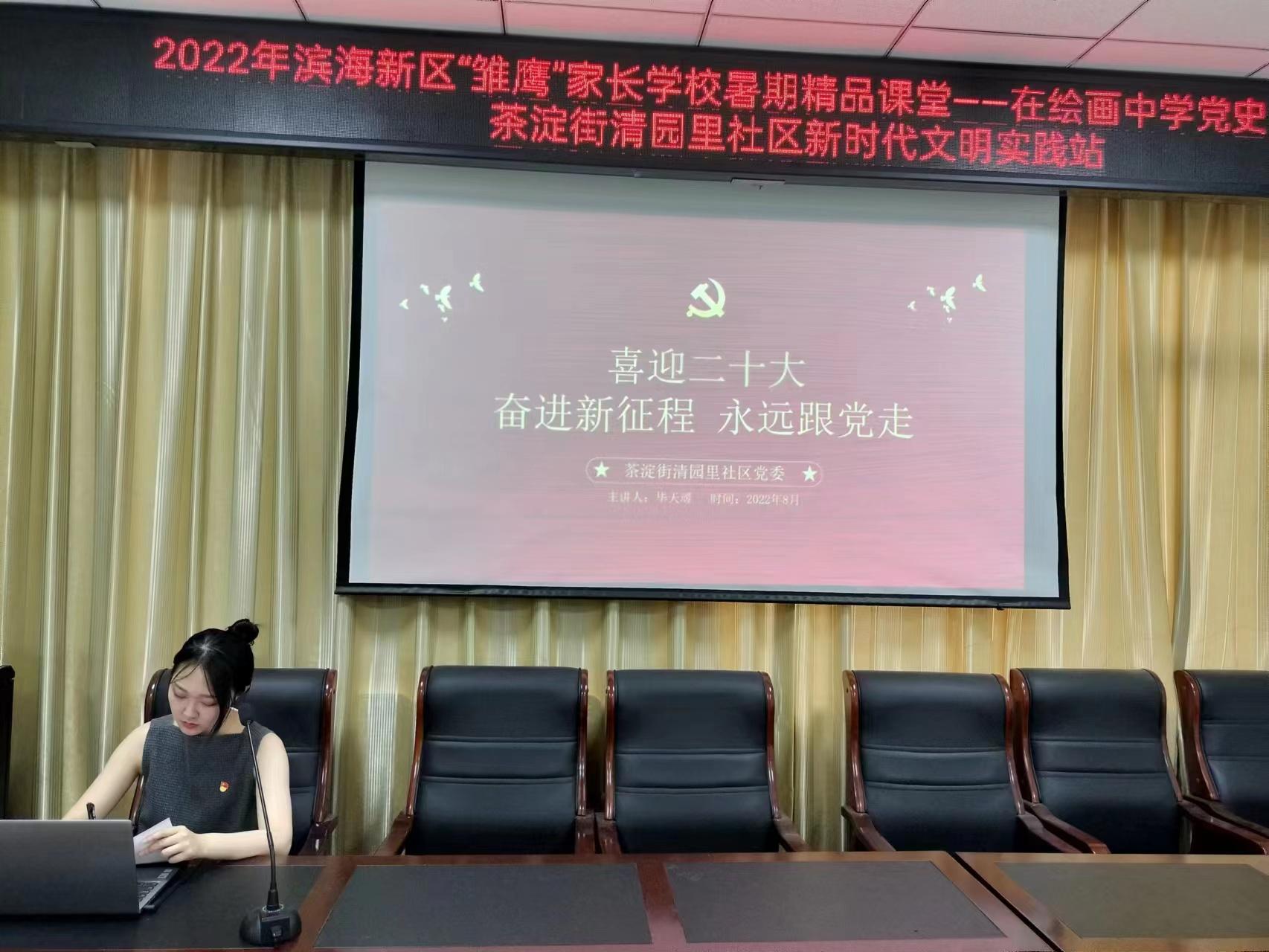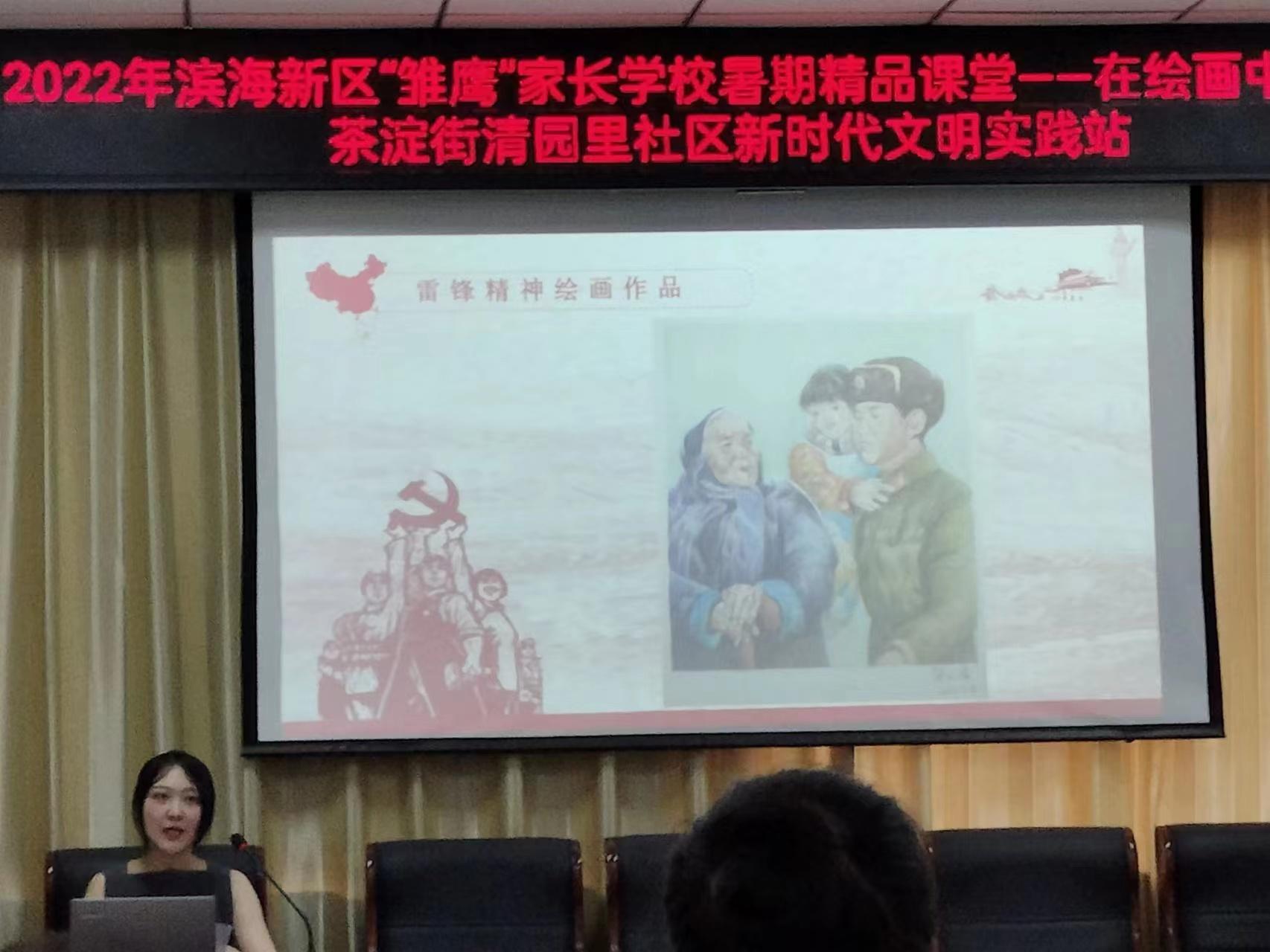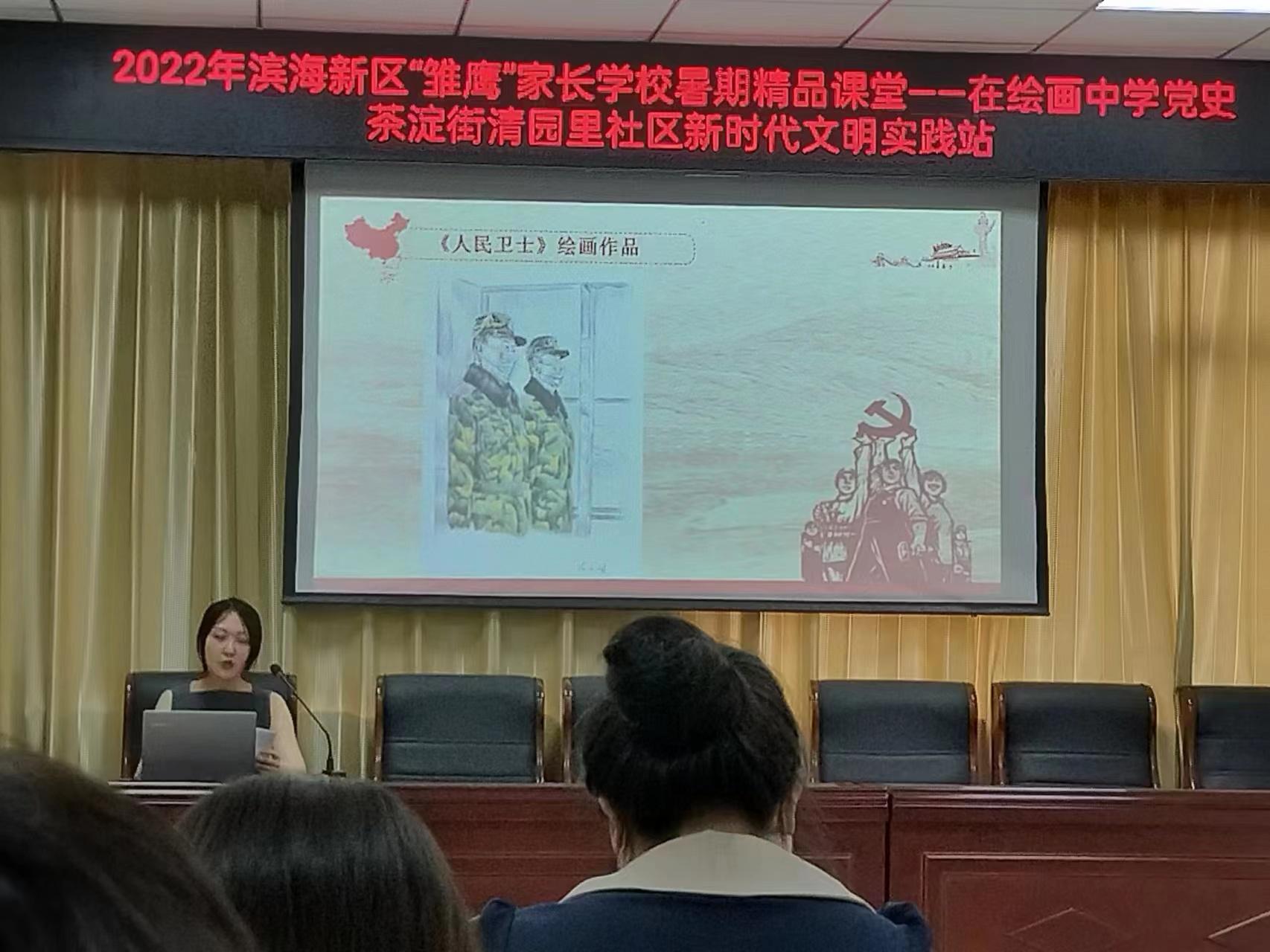 她從“青年興則國家興,青年強則國家強”的角度,激發廣大青少年立牢為國為民之志,要懷著一份赤子的情懷廣泛學習黨史,把愛國之情、報國之志化為實際行動,在新時代貢獻自己的力量。學生和家長在一幅幅精美的繪畫和剪紙作品中,重溫了紅船精神、西柏坡精神,又聽到了雷鋒的故事,更是看到了3年來一線醫務工作者、社區工作者、志愿者們的抗疫防疫的畫面,深刻體會到身邊榜樣的力量。講課結束后,畢天叆現場指導孩子們進行“喜迎黨的二十大”繪畫作品。