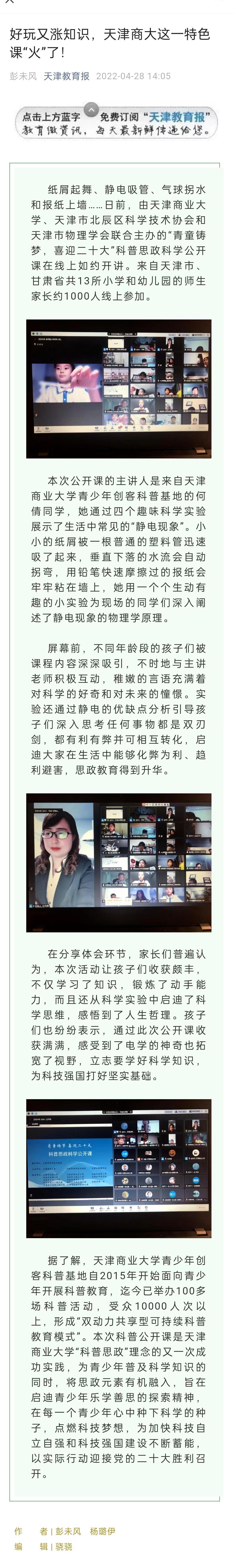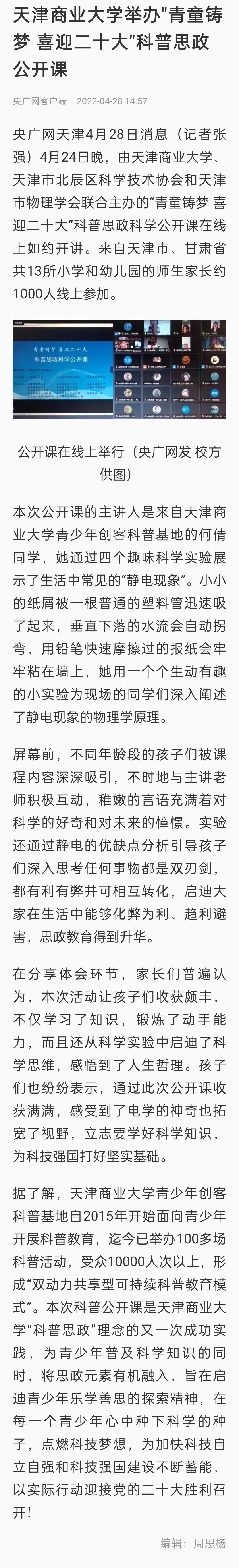 4月28日,央廣網客戶端、天津教育報公眾號報道我校舉辦“青童鑄夢,喜迎二十大”科普思政科學公開課。