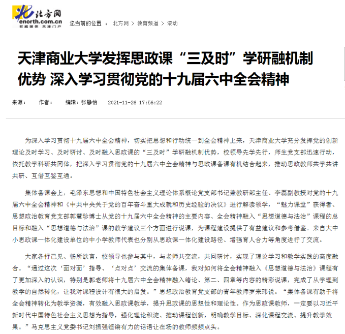 11月26日,北方網以“天津商業大學發揮思政課‘三及時’學研融機制優勢 深入學習貫徹黨的十九屆六中全會精神”為題報道了我校把深入學習貫徹黨的十九屆六中全會精神與思政課備課有機結合起來的情況。