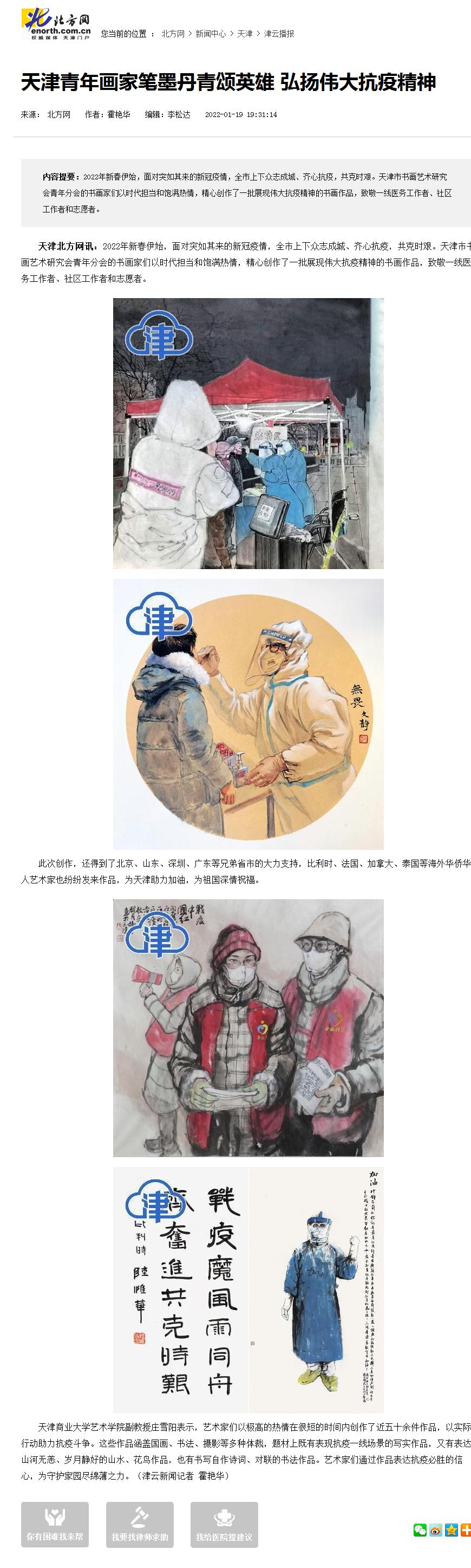 1月19日,津云、北方網(wǎng)以“天津青年畫家筆墨丹青頌英雄 弘揚(yáng)偉大抗疫精神”為題,報(bào)道了我校藝術(shù)學(xué)院教師和天津市書畫藝術(shù)研究會(huì)青年分會(huì)的畫家們一起精心創(chuàng)作了一批展現(xiàn)偉大抗疫精神的書畫作品的事跡。