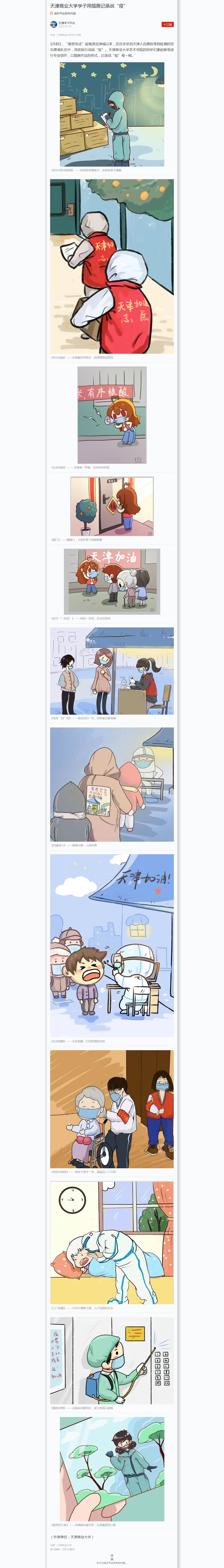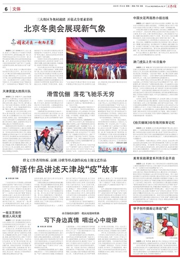 1月22日,學(xué)習(xí)強(qiáng)國(guó)天津?qū)W習(xí)平臺(tái)以“天津商業(yè)大學(xué)學(xué)子用插畫(huà)記錄戰(zhàn)‘疫’”為題報(bào)道我校藝術(shù)學(xué)院的同學(xué)們拿起畫(huà)筆進(jìn)行專業(yè)創(chuàng)作,以插畫(huà)作品的形式,記錄戰(zhàn)“疫”每一幀。1月24日,《天津日?qǐng)?bào)》6版也以“學(xué)子創(chuàng)作插畫(huà)記錄戰(zhàn)‘疫’”為題進(jìn)行報(bào)道。