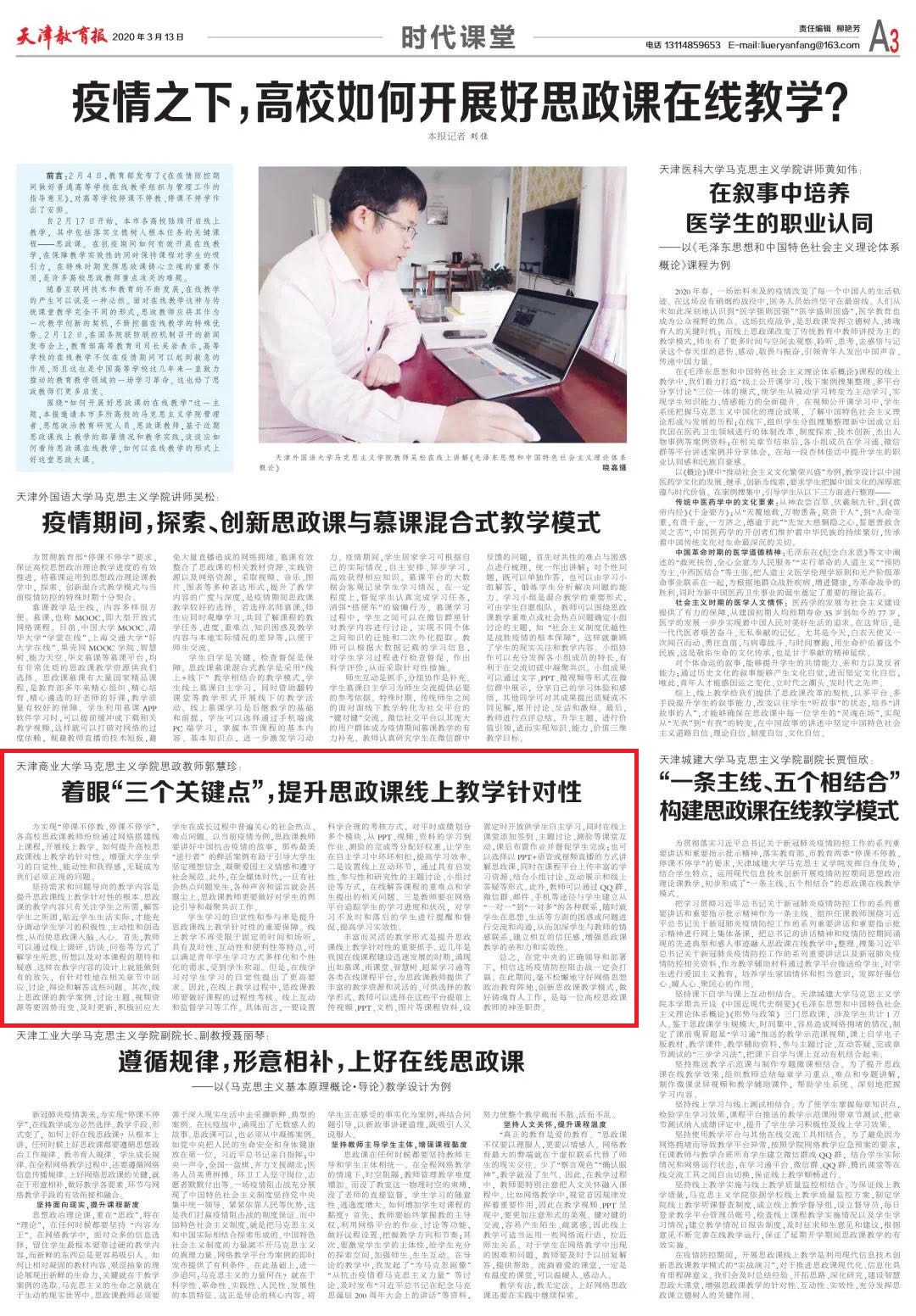 2月24日、3月13日,《天津教育報(bào)》A3版時(shí)代課堂欄目先后刊發(fā)我校馬克思主義學(xué)院青年教師孫興昌博士和郭慧珍博士的理論文章“講好思政‘抗疫’案例,要做到‘四個(gè)講清楚’”及“著眼‘三個(gè)關(guān)鍵點(diǎn)’,提升思政課線上教學(xué)針對(duì)性”。