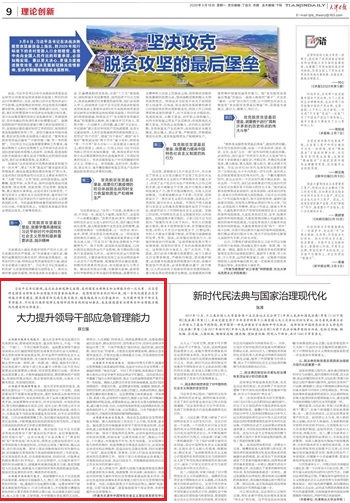 3月16日,《天津日報》(理論創新版)刊發天津市中國特色社會主義理論體系研究中心天津商業大學基地研究員,公共管理學院薛立強副教授理論文章“大力提升領導干部應急管理能力”。文章指出,應急管理是國家治理體系和治理能力的重要組成部分。疫情防控阻擊戰打響以來,進一步優化國家應急管理能力體系建設,提高國家防災減災救災能力,越來越成為人們普遍共識。大力提升領導干部應急管理能力,不僅是打贏新冠肺炎疫情防控阻擊戰的迫切要求,也是推進國家治理體系和治理能力現代化建設的必然要求。文章具體闡述了領導干部需大力提升的六種能力,包括服務大局能力、預測預警能力、科學決斷能力、高效執行能力、平戰結合能力和依法應急能力。(審稿:劉均玲)