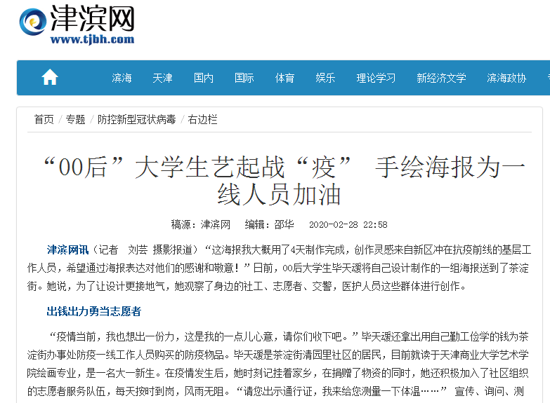 3月18日,天津電視臺《都市報道60分》欄目報道了我校藝術學院學生畢天叆盡己所能,助力疫情防控的事跡。此前,2月24日,今日頭條以“20歲大學生畢天叆助力疫情防控,捐贈防控物品,參與志愿服務”為題,報道了畢天叆助力疫情防控的事跡。大眾新聞、新浪網、中國網等多家媒體轉載。2月28日,津濱網以“‘00后’大學生藝起戰‘疫’手繪海報為一線人員加油”為題對其事跡進行報道。