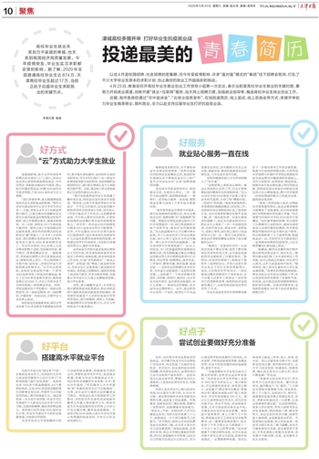 5月20日,《天津日報》10版以“投遞最美的青春簡歷”為題,報道了我市各高校通過“空中宣講會”、“云就業信息發布”、在線投遞簡歷、線上面試、線上雙選會等方式,多措并舉助力畢業生精準擇業、順利就業,全力以赴支持應屆畢業生打好抗疫就業戰。其中,報道了我校招生就業處在疫情期間不間斷為畢業生提供優質就業服務情況,也報道了我校藝術學院工業設計1601班學生羅東從大一開始創業,創建“薛定諤宇宙概念”零售商店和“潮流商城福APP”線上電商平臺的事跡。北方網轉載。