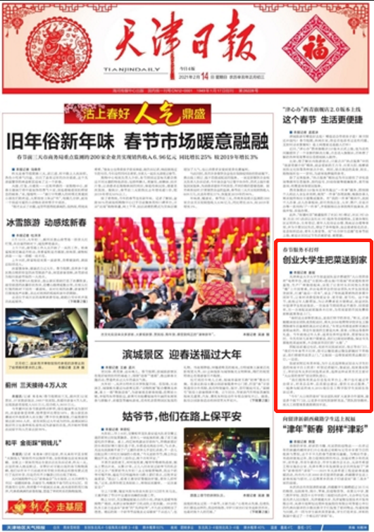 2月14日,《天津日報》1版(要聞版)以“春節服務不打烊 創業大學生把菜送到家”為題報道我校學生創業團隊項目“大山里的食材”電商平臺。