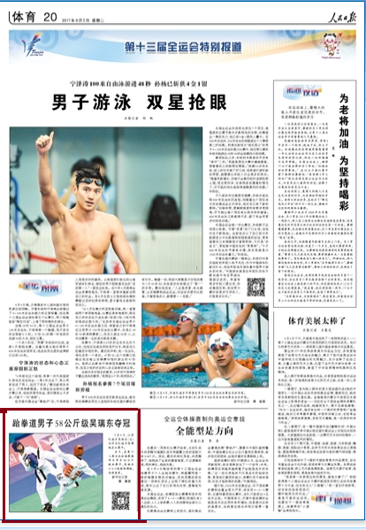 9月5日,《人民日報》體育版以“跆拳道男子58公斤級吳瑞東奪冠”為題報道了在天津商業大學體育館進行的全運會跆拳道比賽。