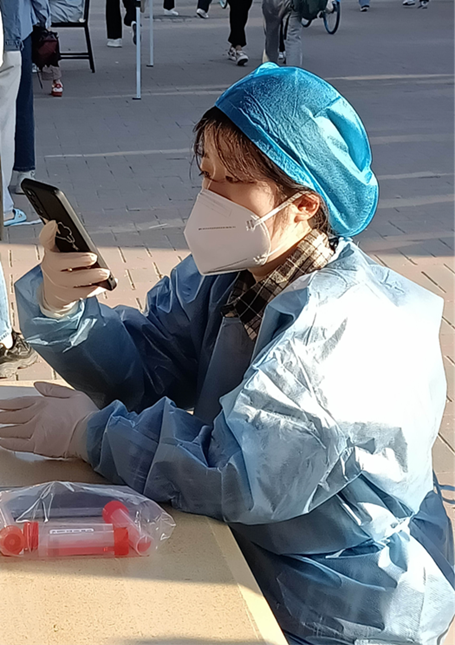 自學(xué)校開展疫情防控工作以來,汪曉雪已參加7次志愿服務(wù)活動,總計27小時,其中包括4次全市大篩核酸檢測掃碼采集信息和3次常態(tài)化核酸檢測掃碼簽到工作。在招募站長時積極報名參加,目前是7號學(xué)生公寓志愿服務(wù)站站長,主要負(fù)責(zé)培訓(xùn)學(xué)生志愿者,對于第一次上崗的志愿者,她會前往核酸檢測采樣點協(xié)助做好前期各項準(zhǔn)備工作,在工作開展過程中強(qiáng)調(diào)每一個關(guān)鍵步驟的注意事項,以確保各個環(huán)節(jié)順利開展。