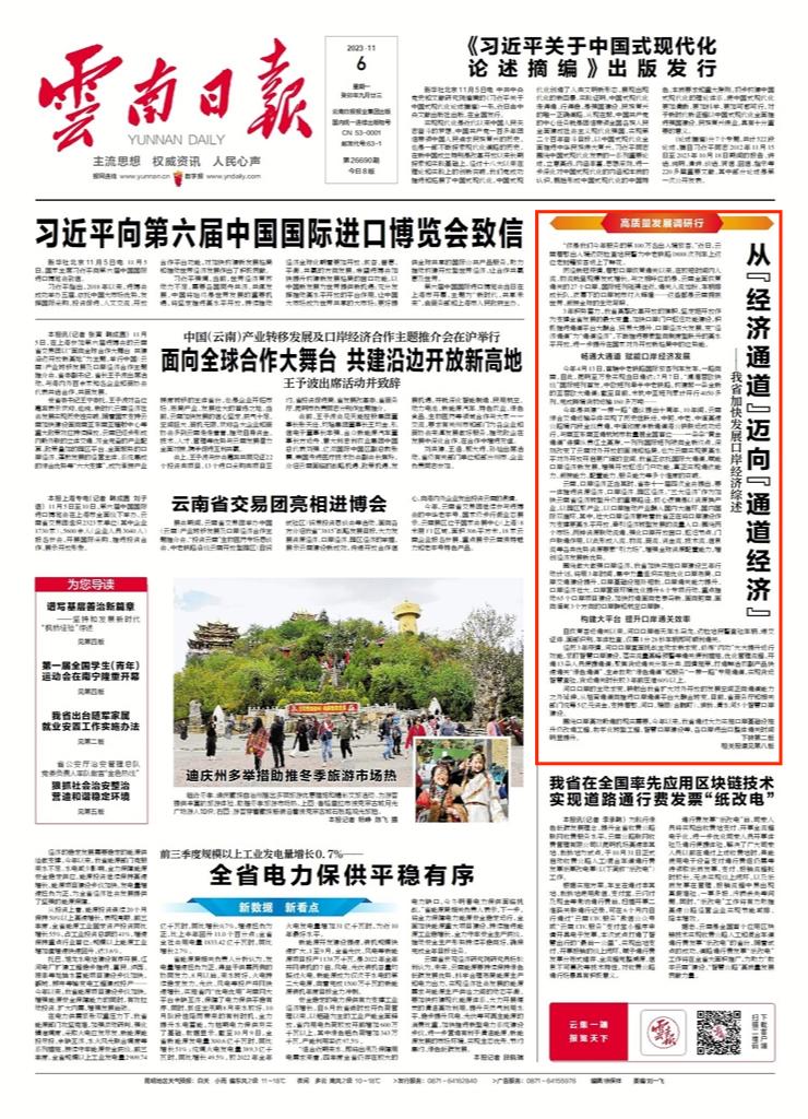 《云南日?qǐng)?bào)》頭版“我省加快發(fā)展口岸經(jīng)濟(jì)綜述”報(bào)道劉輝群的采訪觀點(diǎn)