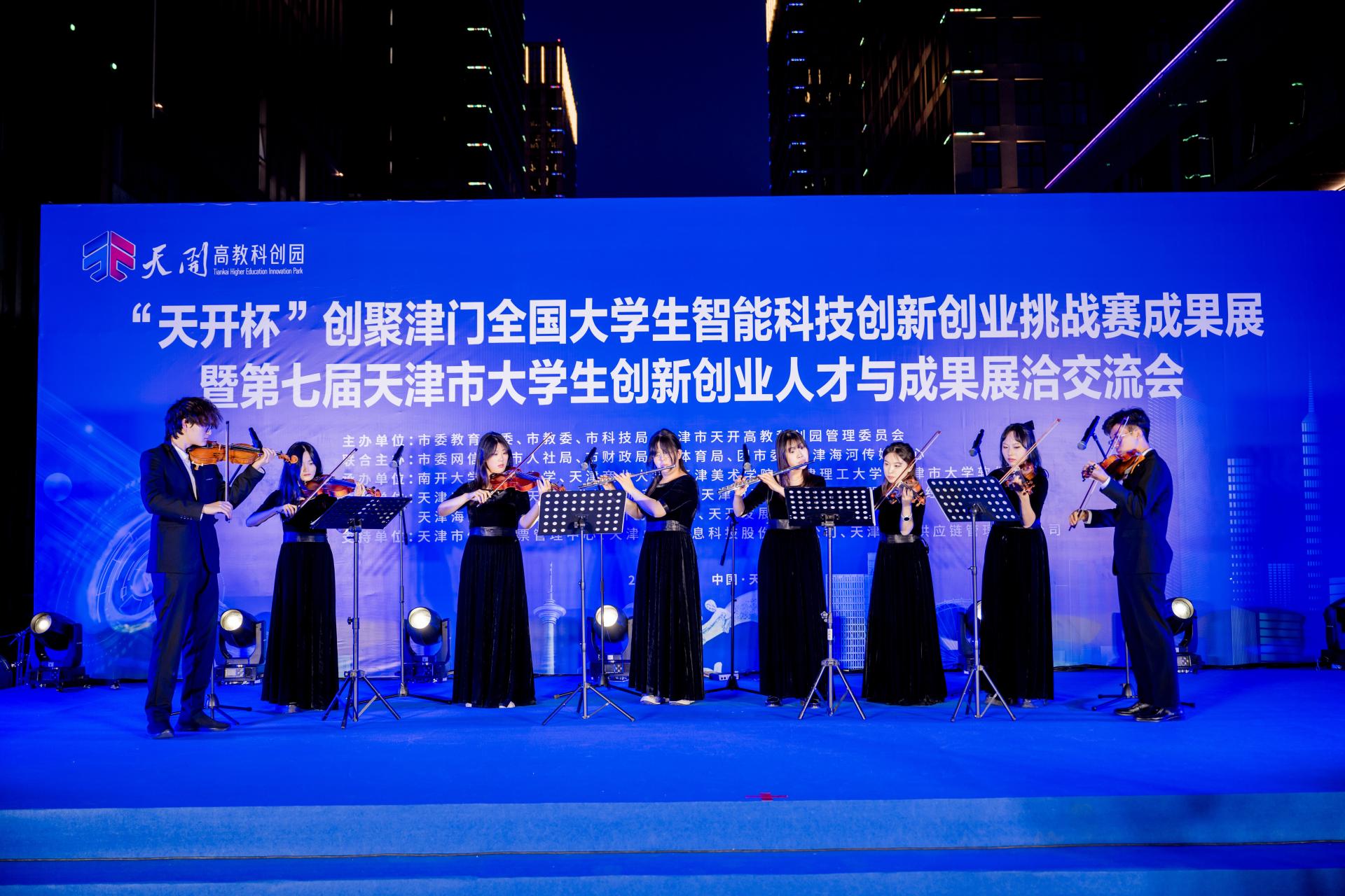 會場還設置成果展,分為3個展區,集中展示了本賽道進入復賽的50個優秀創業團隊的成果。當晚,我校在天開園廣場舉辦“天工開物智創未來”唱響天開音樂會。