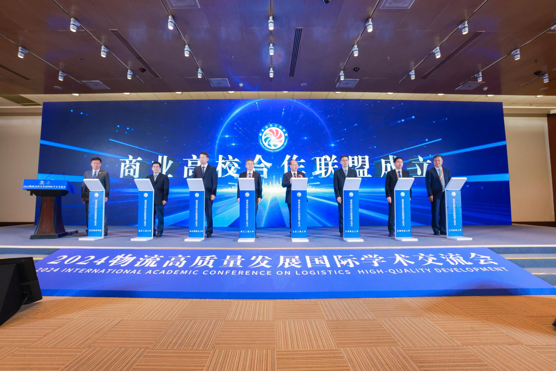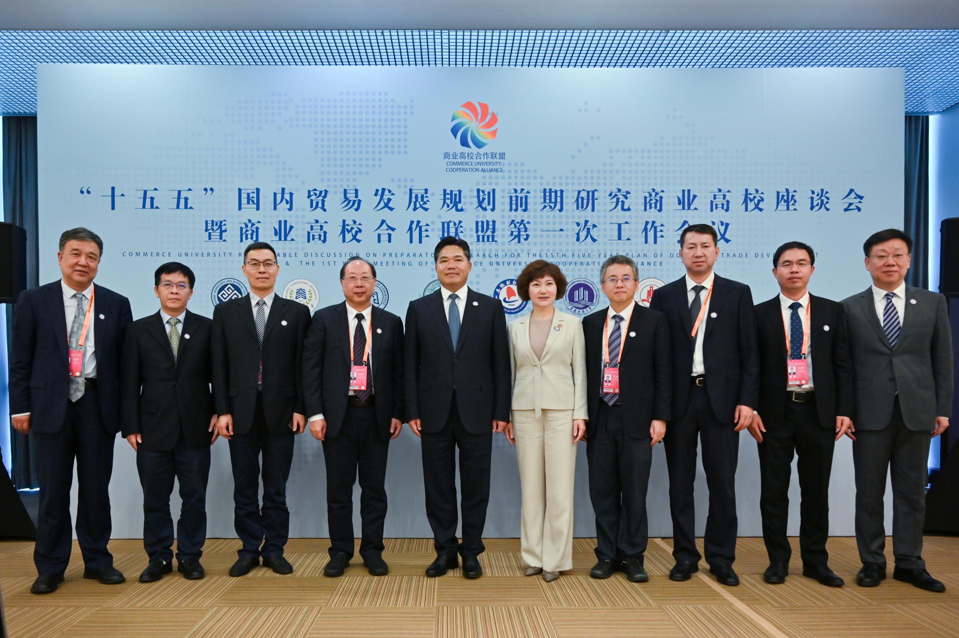 9月13日,在商務部的大力支持下,原商業系統部屬8所高校再度牽手,共同成立商業高校合作聯盟,助力現代化商貿流通體系、貿易強國建設。北京工商大學黨委書記黃先開,浙江工商大學黨委副書記、校長王永貴,天津商業大學黨委書記張亞,哈爾濱商業大學黨委書記趙廣,安徽財經大學黨委副書記、校長朱紅軍,重慶工商大學黨委書記曾維倫,蘭州財經大學黨委副書記、校長王必達,北京物資學院黨委副書記、院長左敏共同登臺,簽署協議并見證“商業高校合作聯盟”成立。儀式后舉行“十五五”國內貿易發展規劃前期研究商業高校專家座談會暨商業高校合作聯盟第一次工作會議,八所高校的領導從不同角度談了專業意見和工作建議。