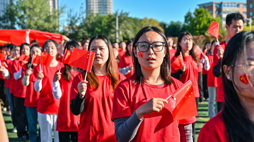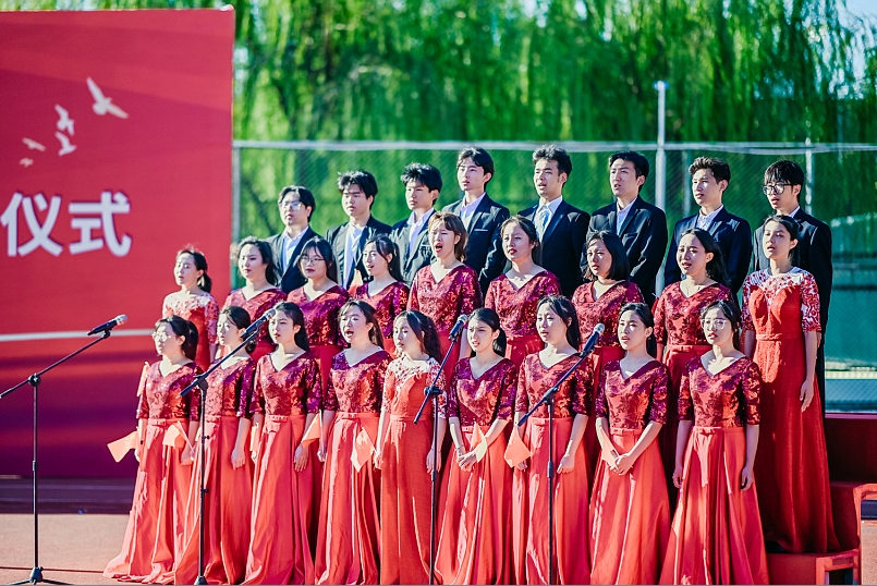 儀式最后,在校合唱團的領唱下,現場師生一起揮舞手中的國旗,深情合唱《歌唱祖國》《我和我的祖國》,伴隨歌聲,一幅巨型國旗由現場師生傳遞,緩緩移至師生方陣中央,向偉大祖國獻上天商師生最衷心的祝福。(審稿:郭景旺 劉桂濤)