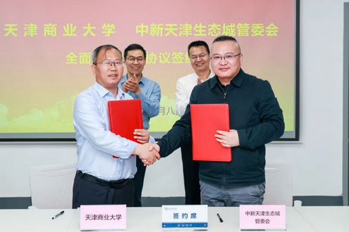 在張亞、王國良的見證下,陳冠益與楊勇簽署天津商業大學與中新天津生態城全面戰略合作協議。