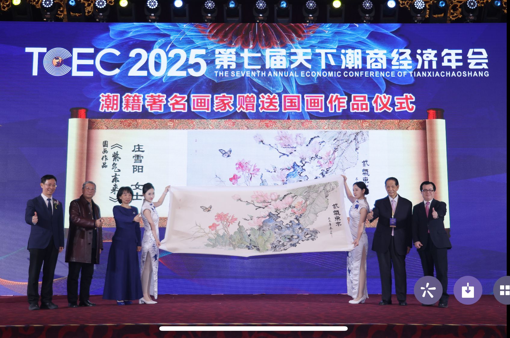 在當(dāng)晚的“天下潮商文化之夜”上,展示了莊雪陽老師為大會創(chuàng)作的八尺巨幅中國畫《紫氣東來》,喻意百花齊放春滿園,新時代,廣大潮商,砥礪奮進(jìn),創(chuàng)新進(jìn)取,續(xù)寫更絢麗的華章!