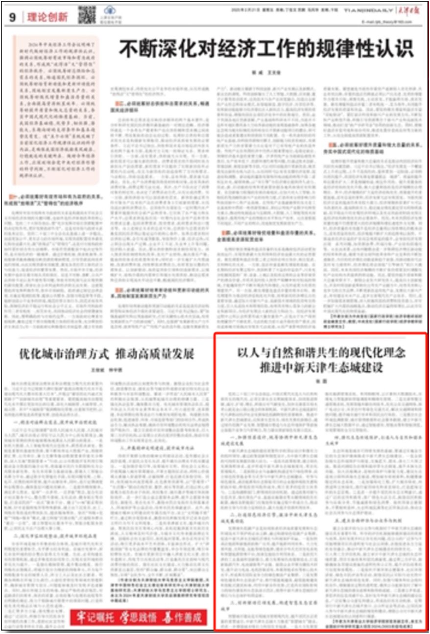 2月21日,《天津日報》(理論創新版)刊發經濟學院張圓副教授理論文章。文章以中國式現代化中人與自然和諧共生的現代化視角出發,從加強頂層設計、打造綠色經濟引擎、創新驅動引領發展、強化生態環境保護及建立全面評估與公眾參與機制五個方面為中新天津生態城建設提供對策建議。