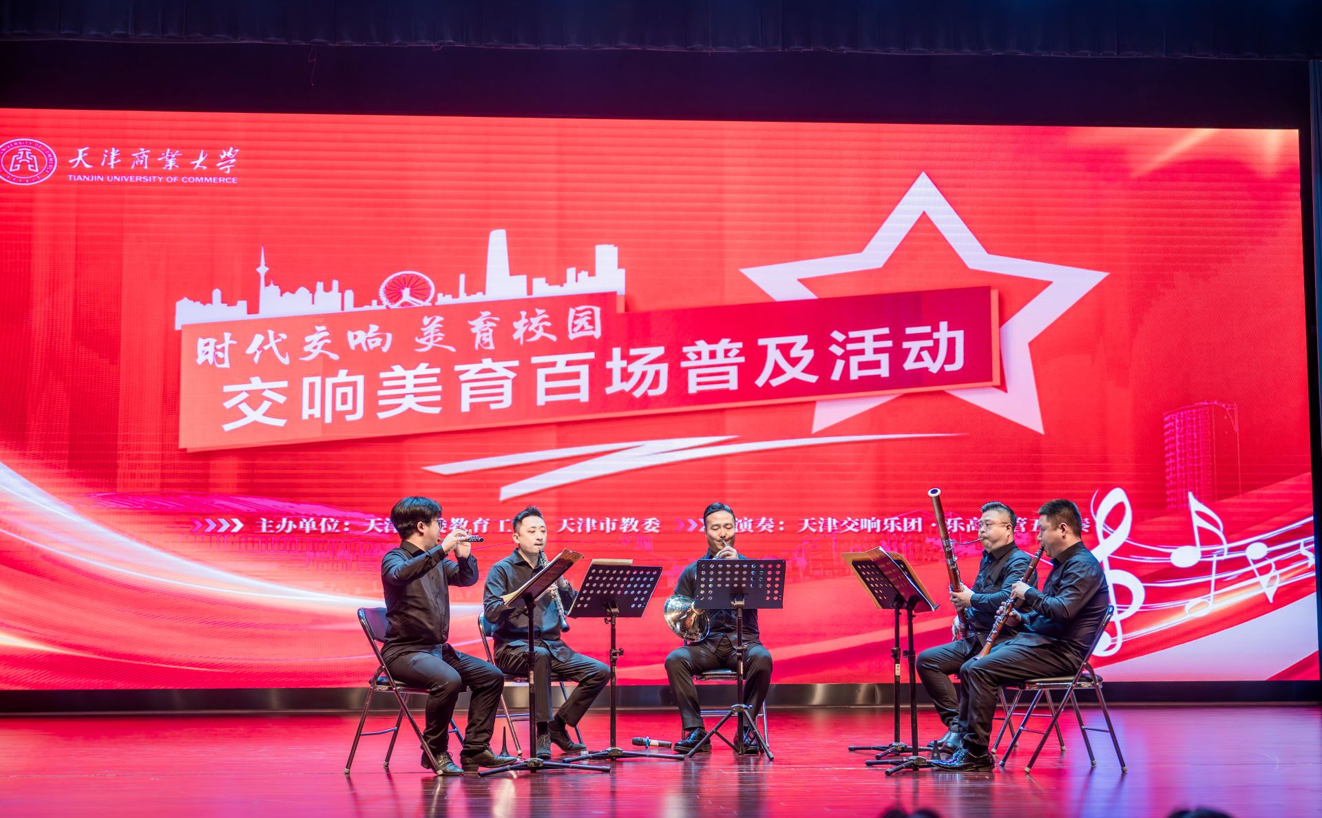 天津交響樂團·樂高木管五重奏組合,為師生演繹了一系列耳熟能詳、喜聞樂見的經(jīng)典曲目。演出中,藝術家們通過充滿活力的精湛演奏和詼諧幽默的曲目導賞,打破高雅藝術的距離感,為同學們打開求知的音樂大門。宮崎駿動漫音樂《魔女宅急便》《千與千尋》典雅精致的古典氣質(zhì)與空靈浪漫的旋律交織,深深打動同學們的內(nèi)心;《打起手鼓唱起歌》《在那遙遠的地方》《鴻雁》《賽馬》《疆域風情》充滿濃郁的民族風情,樂曲意境遼闊深遠,動人心弦;還有《我只在乎你》等耳熟能詳?shù)牧餍行裳杆僖鸫蠹业墓缠Q,拉近了同學們與高雅藝術間的距離。清澈靈動的長笛、甜美抒情的雙簧管、寬廣渾厚的單簧管、低沉詼諧的大管、柔和豐滿的圓號,這五件樂器既展現(xiàn)出不同個性,又給人以和諧統(tǒng)一的整體音效?,勾勒出一幅幅五彩斑斕的油畫。當火爆全網(wǎng)的《孤勇者》奏響,更是煥發(fā)出新的色彩,那朗朗上口的旋律和強烈的節(jié)奏感引發(fā)全場互動,現(xiàn)場沉浸在一片藝術的海洋,掌聲不斷。演奏現(xiàn)場開辦管樂小課堂,老師們用幽默風趣的語言和生動形象的示范,向?qū)W生們講解木管五重奏的樂器特點、演奏技巧以及作品背后的故事,讓同學們在歡樂中聆聽音樂、感受經(jīng)典。