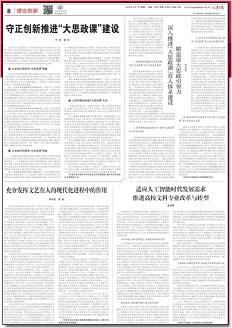 4月7日,《天津日報》(理論創新版)刊發我校黨委副書記王立云理論文章《深入推進“大思政課”育人體系建設 鍛造強大思政引領力》。文章指出,高校要落實立德樹人根本任務,圍繞“培養什么樣的人、如何培養人、為誰培養人”這個根本問題,深入推進“大思政課”育人體系建設,鍛造強大思政引領力,為在新征程上實現全面推進教育強國的戰略任務作出貢獻。
