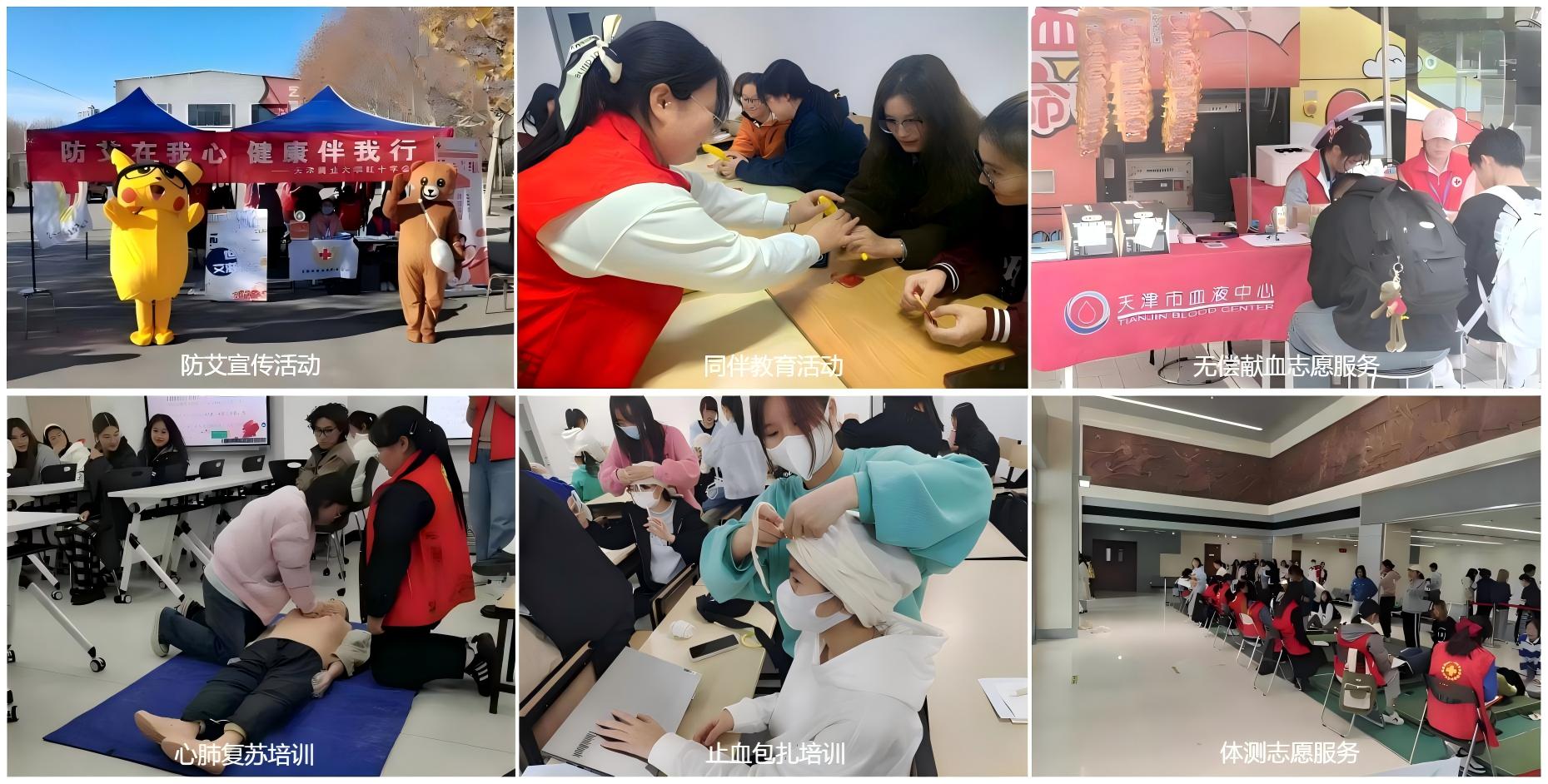 在大家的共同努力下,我校防艾公益項目連續(xù)3年入選天津市青年學生艾滋病防治項目,連續(xù)3年入選天津市“愛·公益”紅十字志愿服務(wù)項目,“知艾防艾 校園有愛”項目入選全國2022“守護青春”防艾公益項目,是天津市高校唯一入選項目。2023年學校入選第二批全國學校急救教育試點學校,2024年入選天津市“紅十字·校園守護”行動民心工程實施計劃,市紅十字會為我校建設(shè)45平米紅十字生命安全健康教室,我校10名教師,350名學生獲得急救資質(zhì)。學校獲全國無償獻血促進獎單位獎。