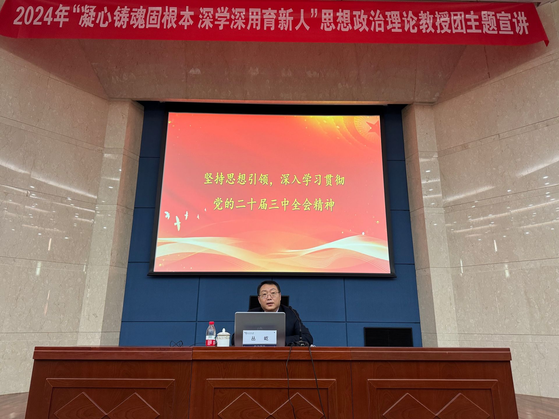 叢屹以“堅持思想引領,深入學習貫徹黨的二十屆三中全會精神”為主題,深入剖析了“五位一體”總體布局與“四個全面”戰(zhàn)略布局的宏偉藍圖,強調(diào)了以人民為中心的發(fā)展思想,深刻解讀了供給側(cè)結(jié)構(gòu)性改革,結(jié)合天津近年來產(chǎn)業(yè)發(fā)展的實際案例,生動詮釋了“創(chuàng)新、協(xié)調(diào)、綠色、開放、共享”這一新發(fā)展理念的深刻意義。