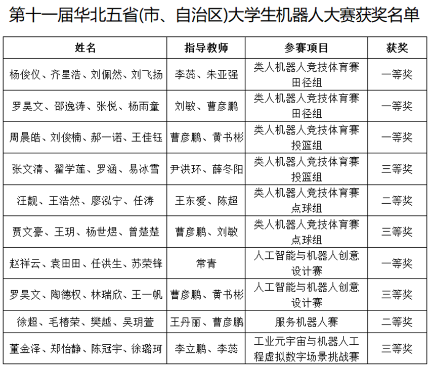 11月15日至16日,第十一屆華北五省(市、自治區)大學生機器人大賽總決賽在北京信息科技大學舉行。經過激烈的現場角逐,我校的12支代表隊取得優異成績。其中,獲一等獎4項、二等獎2項、三等獎4項。我校常青、李蕊、朱亞強、曹彥鵬、黃書彬、劉敏獲優秀指導教師,我校獲優秀組織獎。