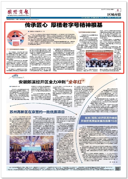 11月25日,《國際商報》刊發(fā)校黨委書記張亞闡釋文章《傳承匠心 厚植老字號精神根基》。文章指出,天津商業(yè)大學作為首批全國老字號協(xié)同創(chuàng)新中心,一年來,在商務(wù)部的指導幫助下,與多家老字號企業(yè)合作,建立產(chǎn)學研基地,組建團隊開展專題調(diào)研與交流合作,作為牽頭編寫單位完成《匠心百年傳》初稿,承辦了商務(wù)部老字號嘉年華活動,在全校上下初步形成了走進老字號、喜愛老字號、研究老字號、賦能老字號的良好氛圍。