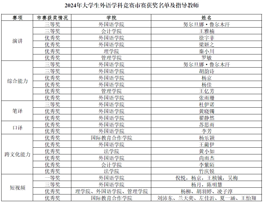 在學(xué)校教務(wù)處的大力支持下,外國(guó)語(yǔ)學(xué)院精心組織各賽項(xiàng)校級(jí)比賽,共吸引全校600余名學(xué)生參與,最終選拔出17名選手以及2支團(tuán)隊(duì)、4件短視頻作品參加天津市比賽。學(xué)院始終把競(jìng)賽作為促進(jìn)教學(xué)改革、提高人才培養(yǎng)質(zhì)量的重要抓手,堅(jiān)持“以賽代練、以賽促教、以賽促建、以賽育人”的人才培養(yǎng)理念,不斷完善競(jìng)賽的激勵(lì)和保障機(jī)制,通過(guò)豐富多彩的學(xué)科競(jìng)賽,提高學(xué)生的跨文化交際以及外語(yǔ)實(shí)際應(yīng)用水平,鼓勵(lì)學(xué)生在比賽環(huán)境中挑戰(zhàn)自我、提升自我。本次比賽不僅展現(xiàn)了我校學(xué)生優(yōu)秀的語(yǔ)言素養(yǎng),也增強(qiáng)了學(xué)生用外語(yǔ)講好中國(guó)故事、傳播好中國(guó)聲音的信心和能力。(審稿:劉桂濤)