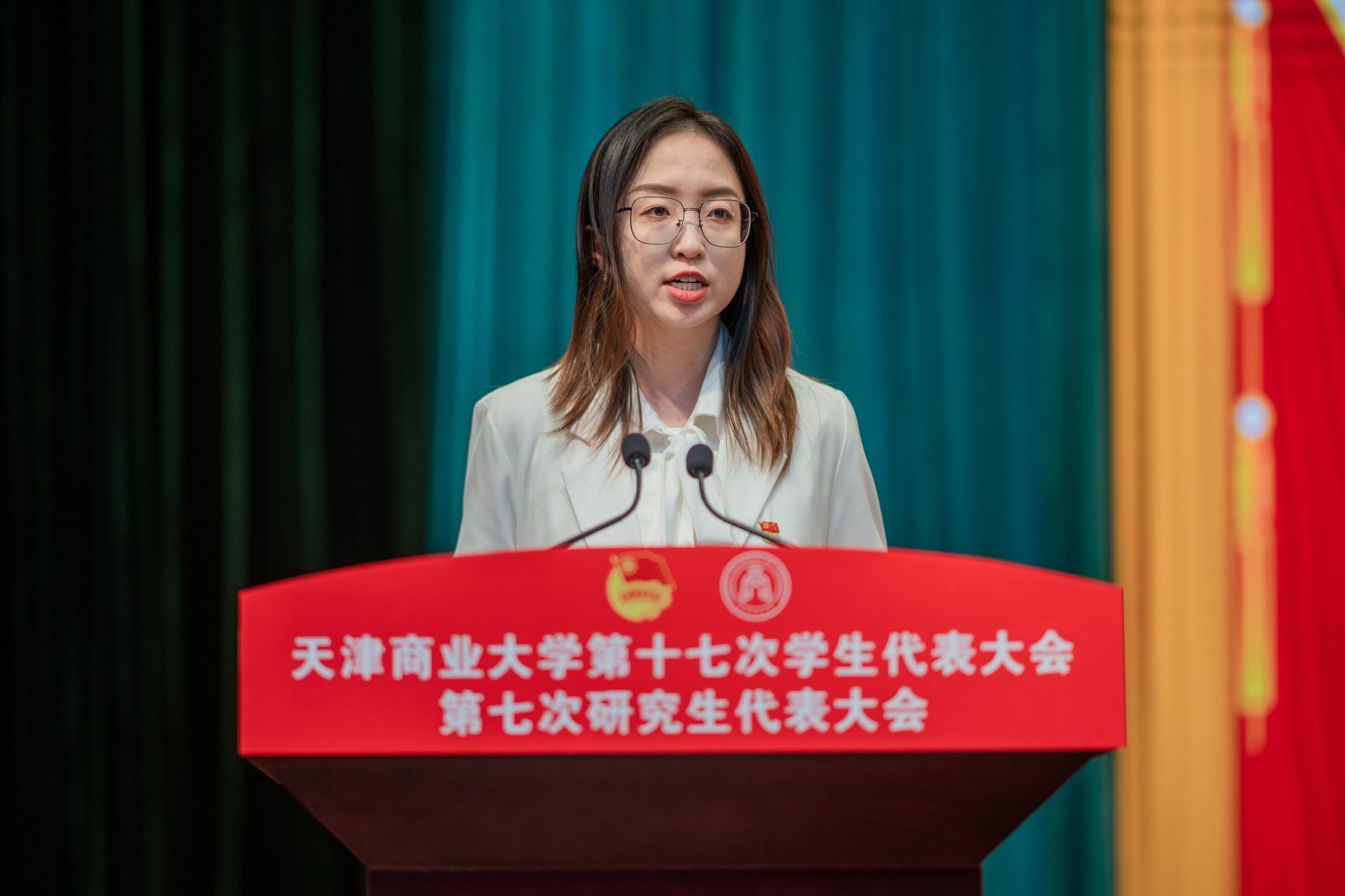 薛鈺川代表市學聯對學校第十七次學生代表大會、第七次研究生代表大會的召開表示熱烈祝賀,充分肯定天津商業大學學生會、研究生會過去一年的工作成果。她指出,全校各級學生會組織要聚焦主責主業,充分彰顯學生會組織的政治本色;踐行服務宗旨,努力做好黨聯系學生的橋梁紐帶;持續深化改革,錘煉打造服務型的先進學生組織,在推進強國建設、民族復興偉業中展現青春作為、彰顯青春風采、貢獻青春力量,奮力書寫為中國式現代化挺膺擔當的青春篇章。