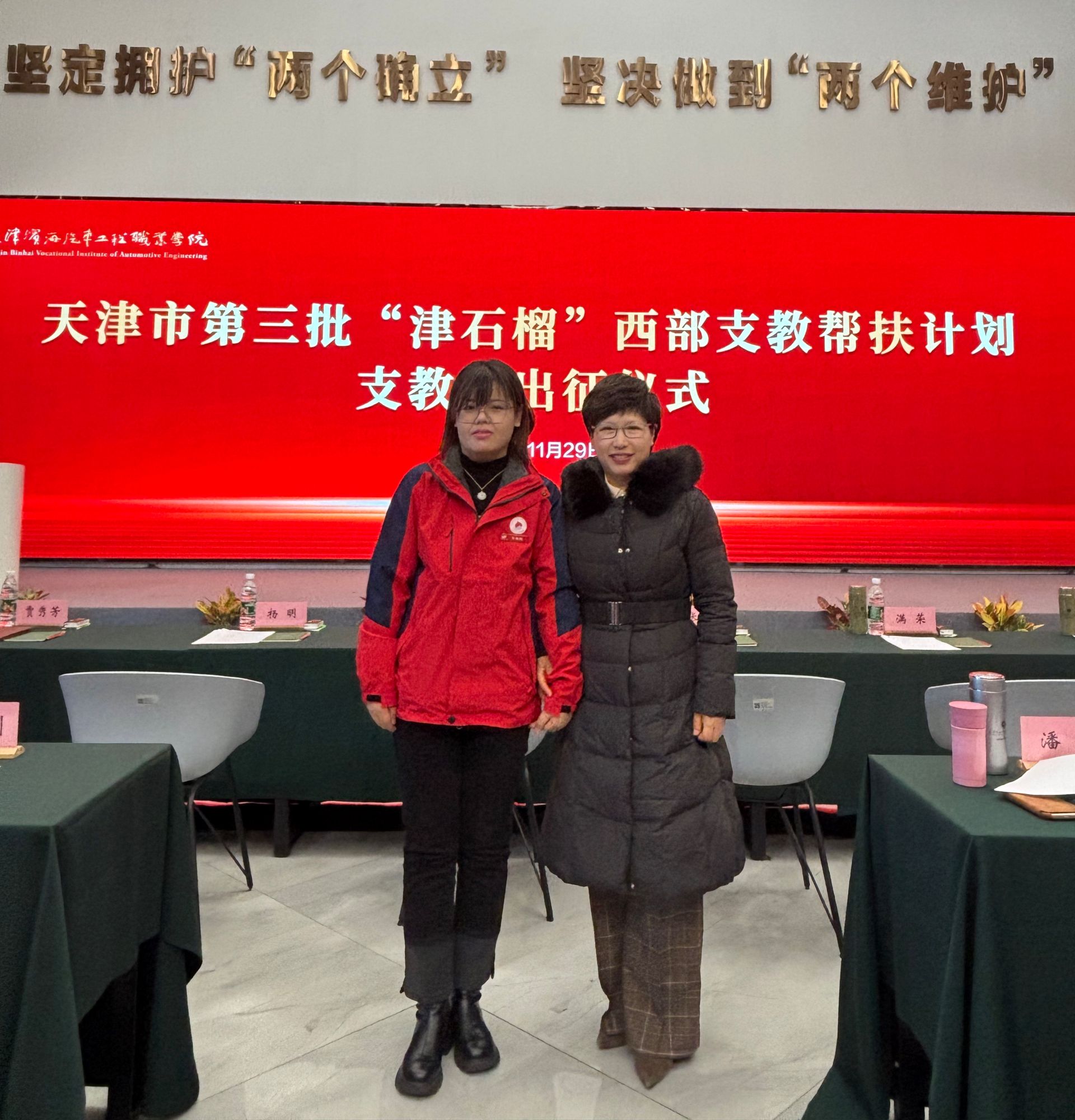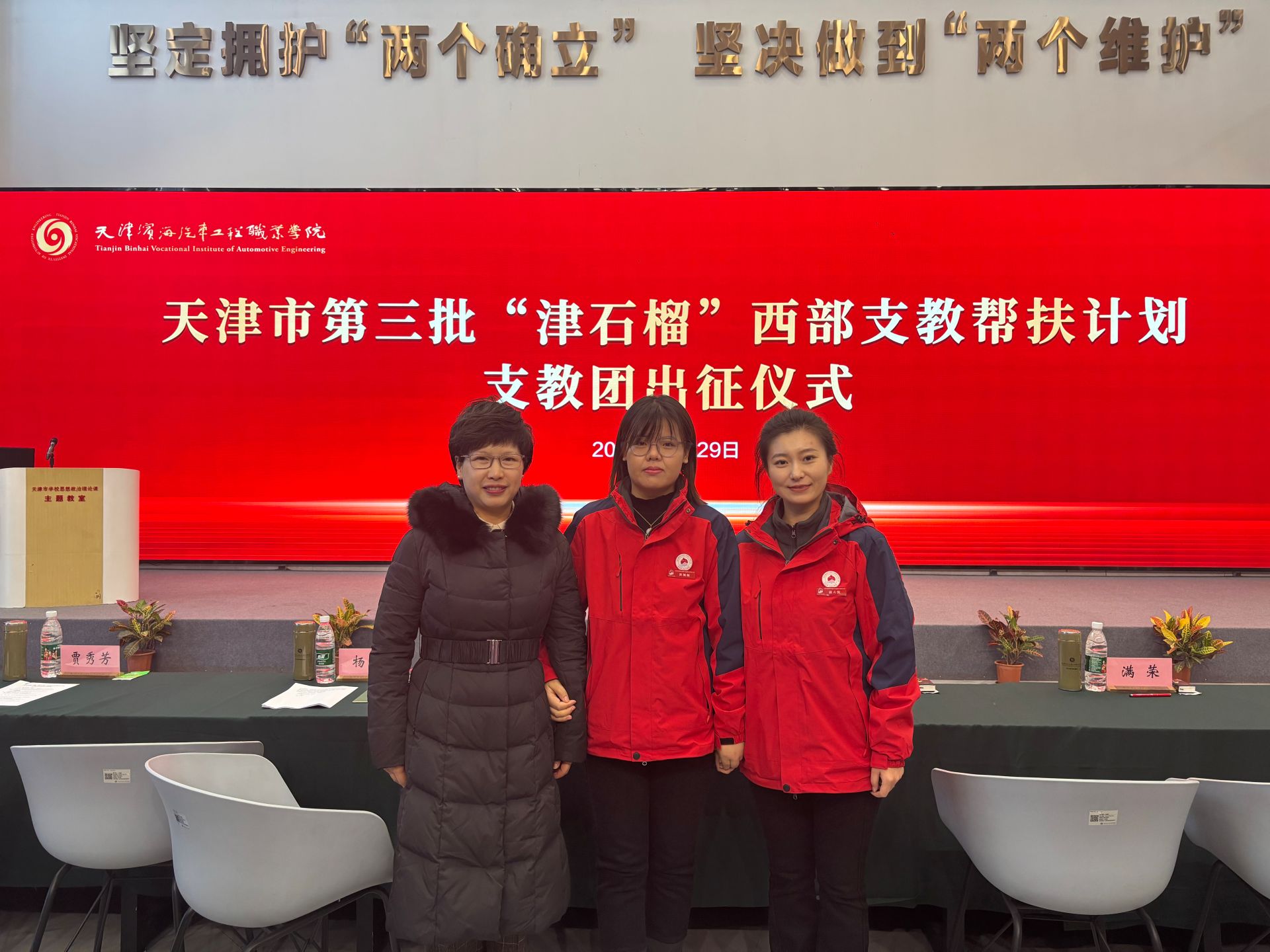 11月29日,天津市第三批“津石榴”西部支教幫扶計劃支教團出征儀式在天津濱海汽車工程職業學院天津市學校思想政治理論課主題教室舉行。校黨委副書記王立云應邀參加出征儀式。我校理學院輔導員狄佩佩成功入選支教團成員,赴新疆和田地區策勒縣開展為期半年的思政課教學工作。
