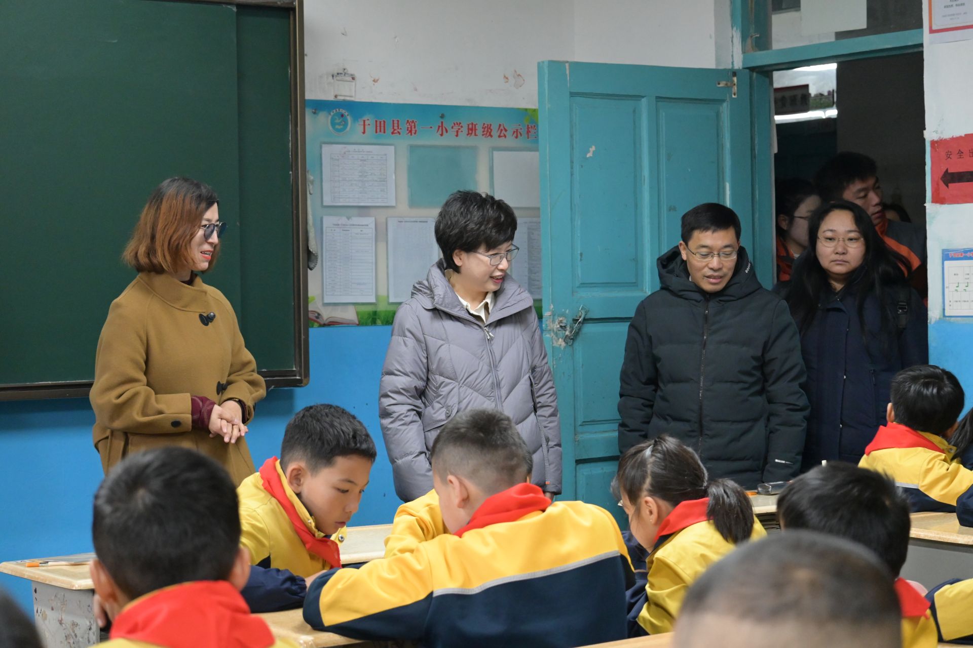 12月5日,王立云一行前往于田縣第一小學、于田縣第二幼兒園現場考察調研,走進教室觀摩支教團成員課堂教學與班級特色展示,參觀興趣社團成果展示墻、“共筑中國夢”墻繪作品,并向兩所學校捐贈文體用品。在于田縣第一小學,與于田縣教育局相關負責同志、學校領導、師生代表開展座談,了解支教團在第一小學的工作開展情況。會前,與學校2021屆畢業生、于田縣木尕拉鎮人民政府司法所所長王軍交流在當地的工作生活情況,鼓勵更多學生扎根西部,讓青春綻放在祖國最需要的地方。