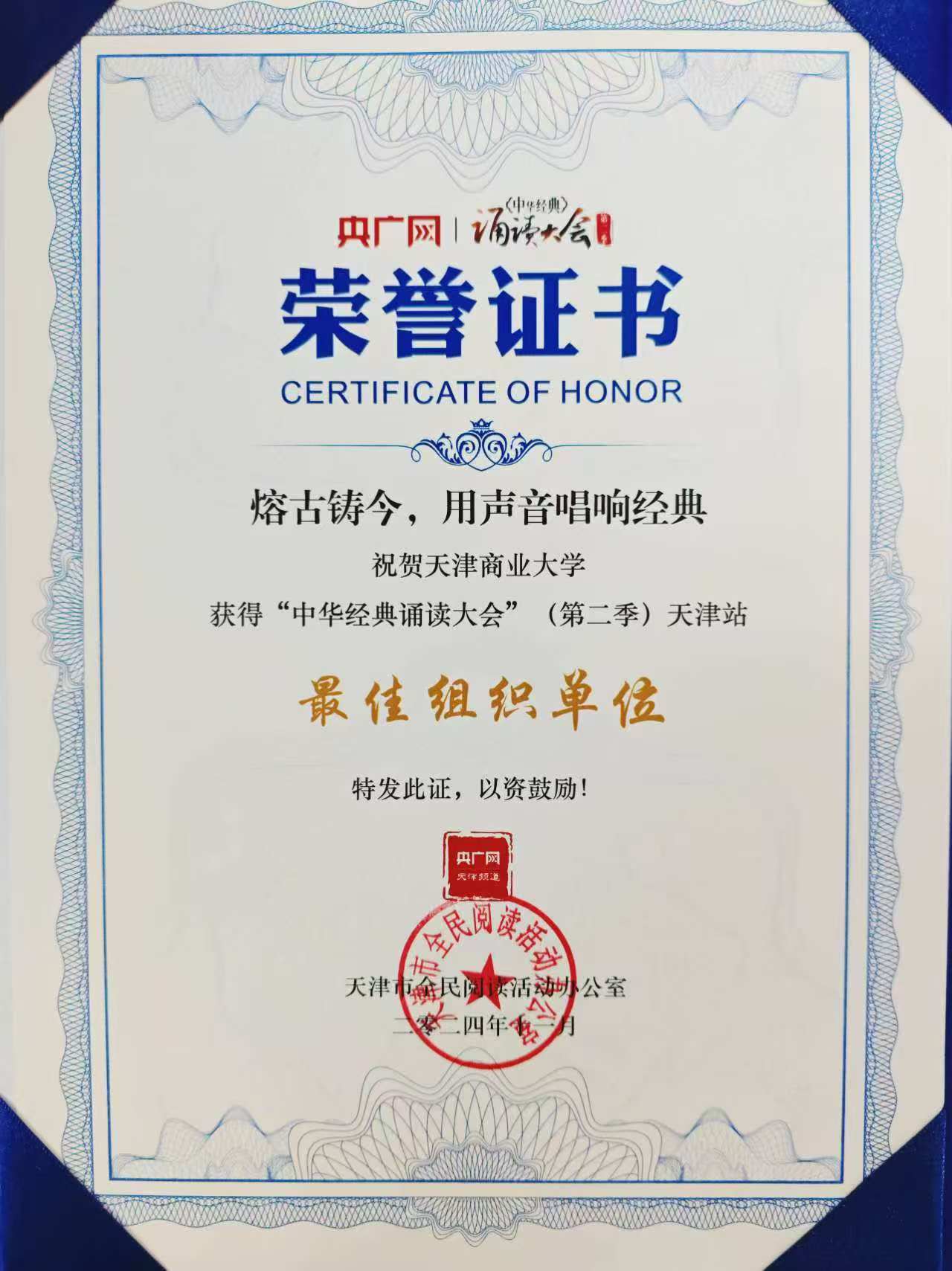 近日,中華經典誦讀大會(第二季)天津站展演暨頒獎典禮在天津海河劇院隆重舉行。我校外國語學院李錦睿、管理學院咼亞薇、法學院王徵三位同學獲大學生組二等獎,退休教師邢素軍獲“樂齡組”最具實力獎,學校獲最佳組織獎。