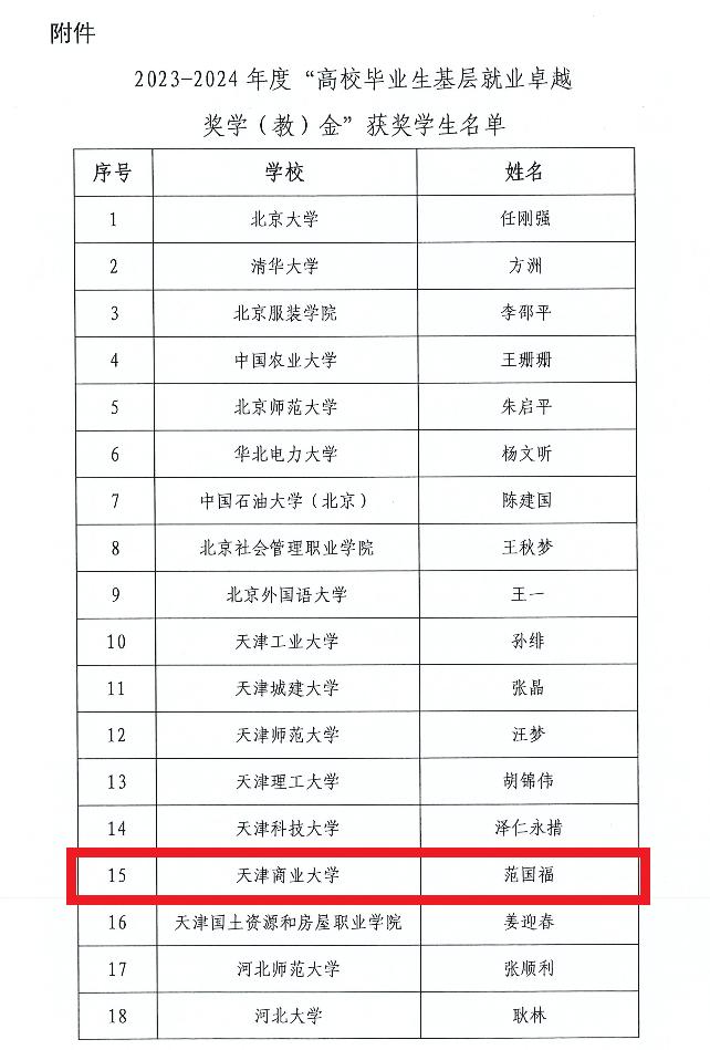 近日,教育部高校學生司(高校畢業(yè)生就業(yè)服務(wù)司)轉(zhuǎn)發(fā)了《關(guān)于公布2023—2024年度“高校畢業(yè)生基層就業(yè)卓越獎學(教)金”獲獎人選的通知》,398名優(yōu)秀高校畢業(yè)生獲“高校畢業(yè)生基層就業(yè)卓越獎學金”,其中天津市7名,我校2016屆工業(yè)設(shè)計專業(yè)畢業(yè)生范國福獲此殊榮。